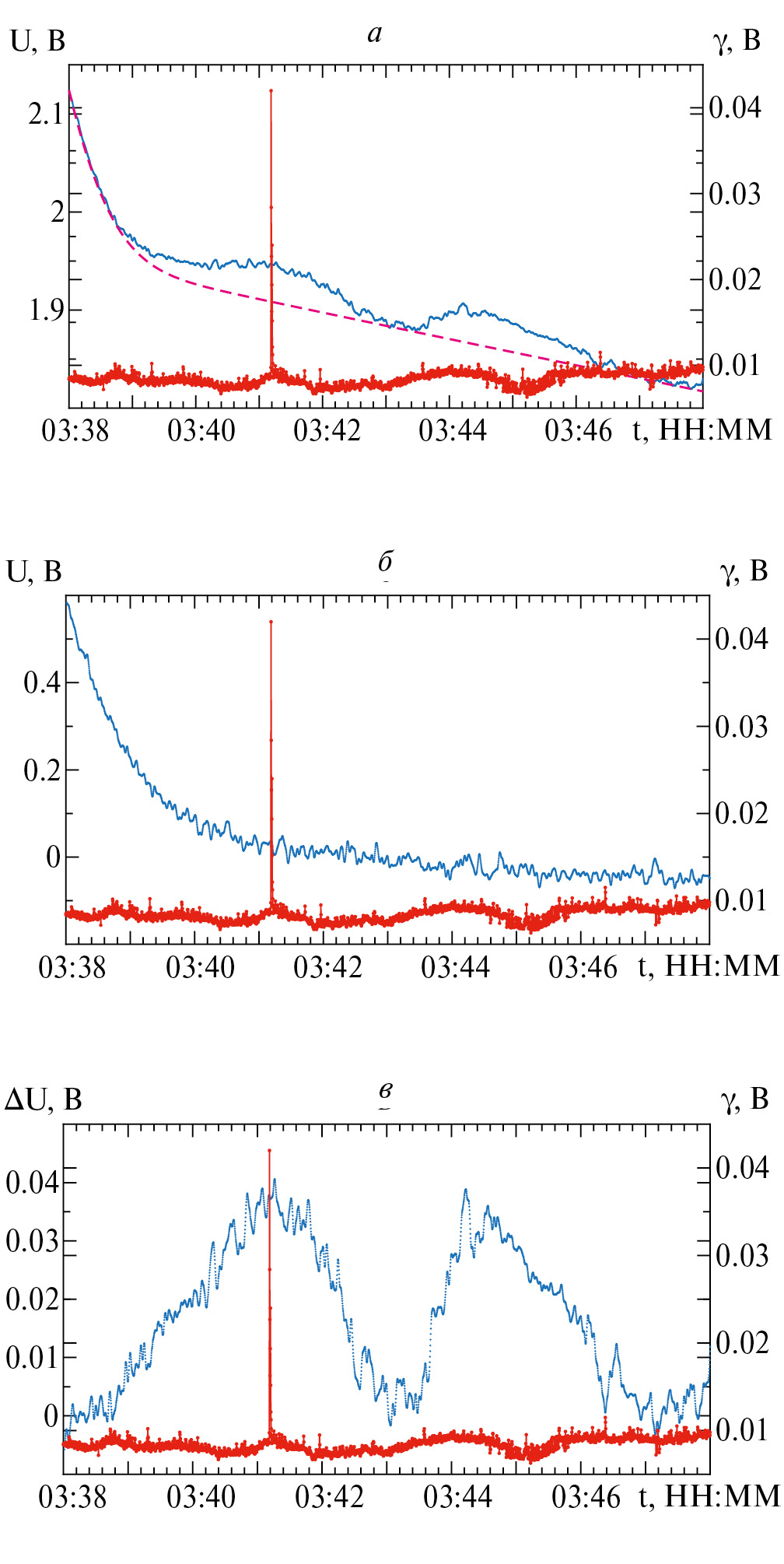 Для определения особенностей излучения в грозовом облаке на рис. 3в представлена разность значений интенсивности излучения на 1.35 см и на линии тренда (по результатам, представленным на рис. 3а). По полученным данным длительность первой фазы микроволнового свечения на волне 1.35 см составляла 4 минуты (рис. 3а). Максимум первой фазы повышения микроволнового излучения совпал с гамма-вспышкой. Так же, как и для свечения, представленного на рис. 2, обнаружено второе возрастание микроволнового излучения с длительностью ~3 минут без повышения интенсивности гамма-излучения.