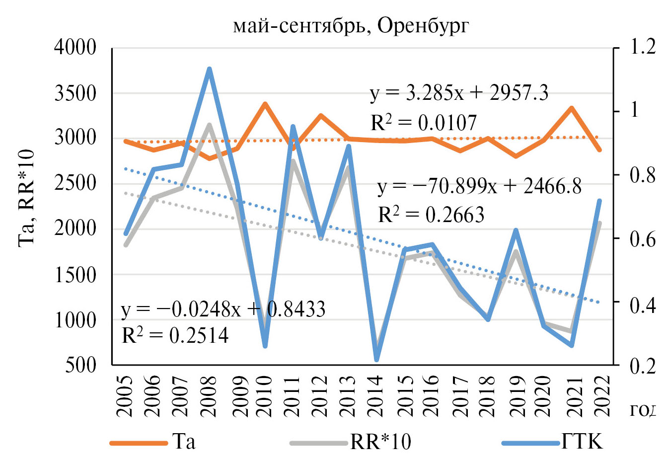 Наиболее часто используемым количественным показателем климата является гидротермический коэффициент Селянинова (Селянинов, 1928; 1958). Определяется ГТК так: ГТК = 10 × ΣRR / ΣТa, где ΣRR – сумма осадков за вегетационный период (период со среднесуточными температурами воздуха больше 10°C), ΣТa – сумма среднесуточных температур за этот же период. На рис. 2 приведены графики значений ГТК, а также суммы температур и осадков*10 за май÷сентябрь 2005–2022 гг. для станции Оренбург (ID35121). График ГТК повторяет график количества осадков при практически не меняющихся среднегодовых вариациях за май-сентябрь температуры воздуха. Абсолютный минимум ГТК и осадков принадлежит 2014 году (ГТК = 0.2165). Следующие минимумы ГТК в порядке возрастания значений принадлежат 2010 году (0.26) и 2021 году (0.261). Отрицательный тренд значений суммы осадков и слабый положительный тренд значений суммы температур воздуха за вегетационный период стали основанием для отрицательного тренда значений ГТК за 2005–2022 гг., что свидетельствует о тенденции усиления аридности территории.