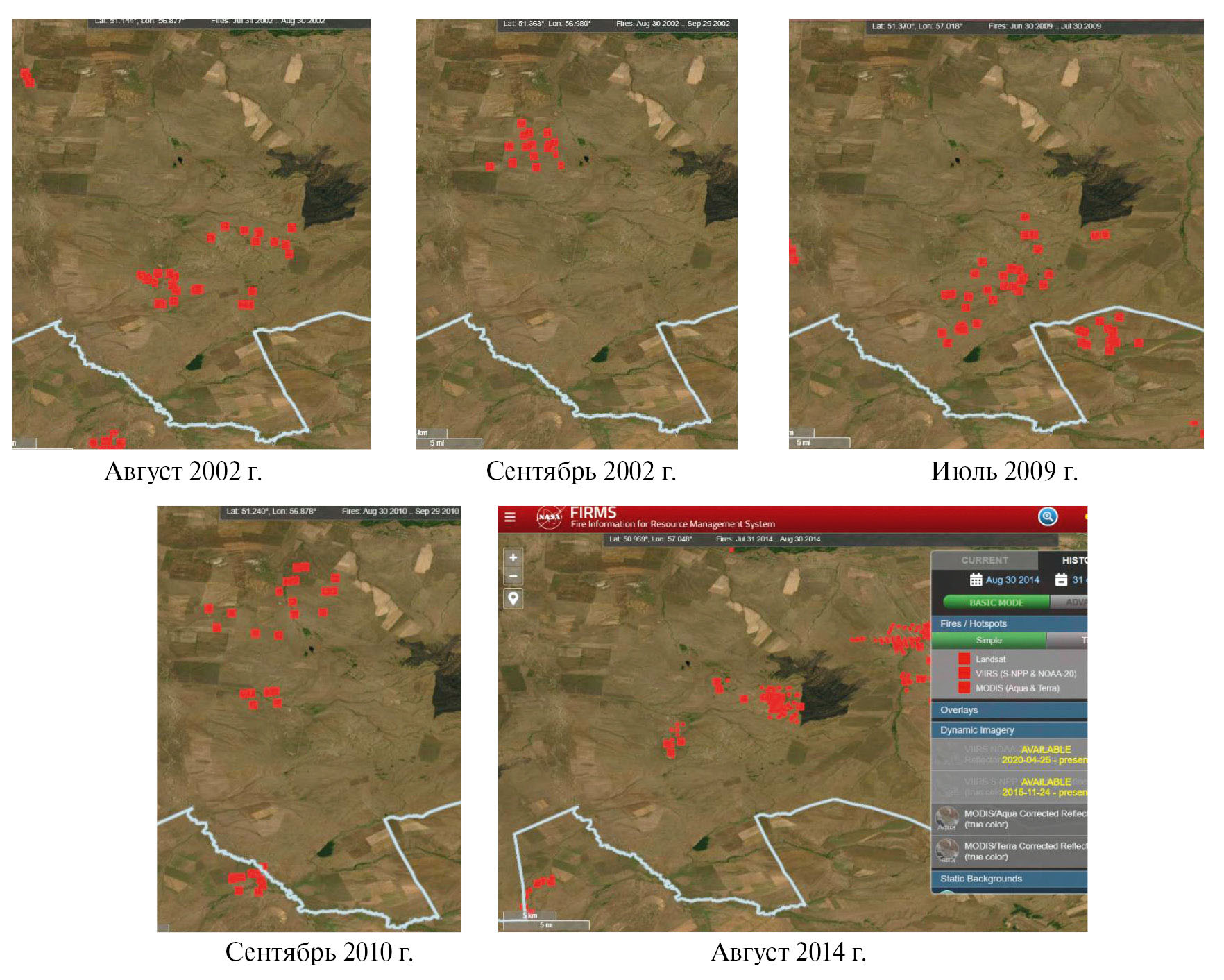 На рис. 3 показаны карты пожаров на территории Буртинской степи за 2002, 2009, 2010 и 2014 гг., взятые в архиве https://firms.modaps.eosdis.nasa.gov/map/#t: adv; d:2014-07-31.2014-08-30;@56.8,51.1,11z.