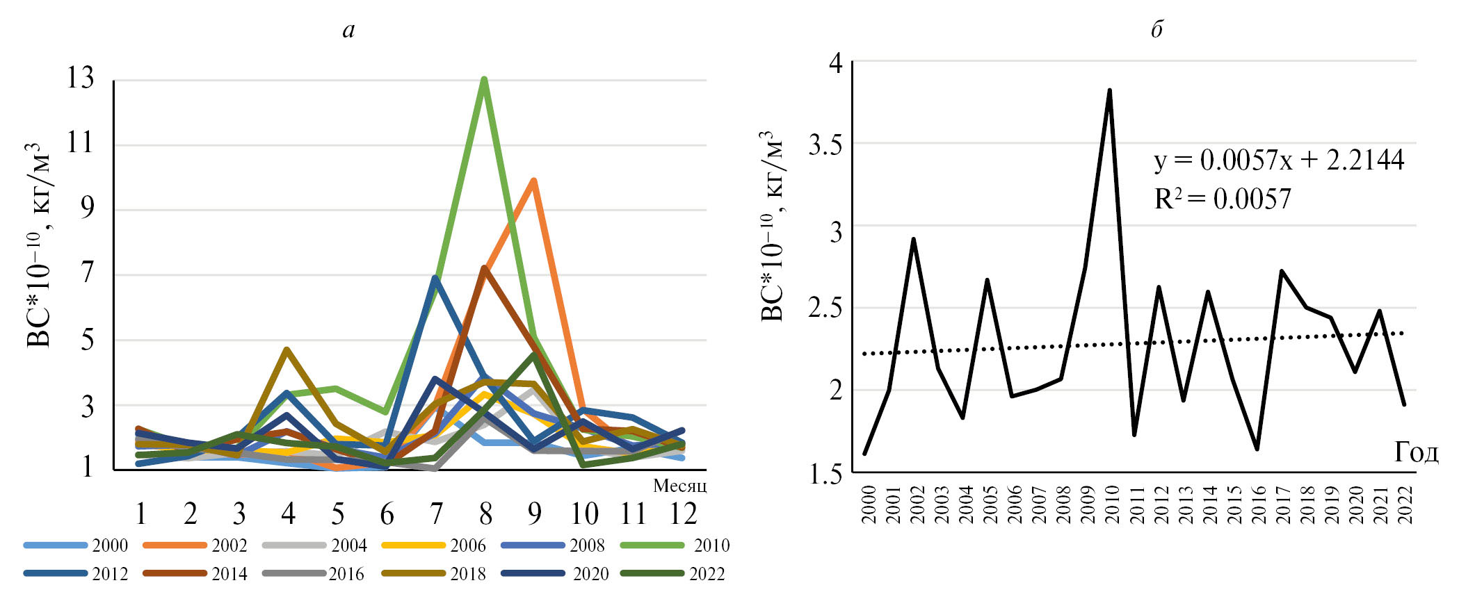 Для межгодовых вариаций ВС (рис. 4б) тренд положительный как для всего исследуемого периода 2000–2022 гг., так и для отдельных его циклов: 2000–2010 гг., 2011–2022 гг. (для последнего цикла угол линии тренда уменьшился). С интенсивными пожарами в 2010 году связан всплеск межгодовых значений ВС этого года с абсолютным максимумом, равным 3.8 × 10–10 кг/м3; второй по значению максимум принадлежит 2002 году (2.9 × 10–10 кг/м3), третий – 2009 году (2.7 × 10–10 кг/м3). Близкими к последнему являются значения ВС в 2005, 2011, 2012, 2014, 2017 гг.
