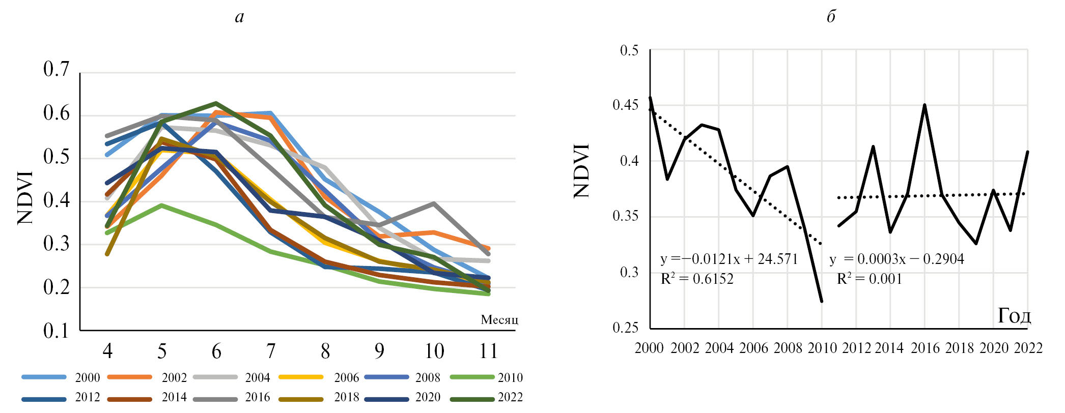 Рис. 5. Сезонные (а) и межгодовые (б) вариации NDVI для Буртинской степи за период 2000–2022 гг.