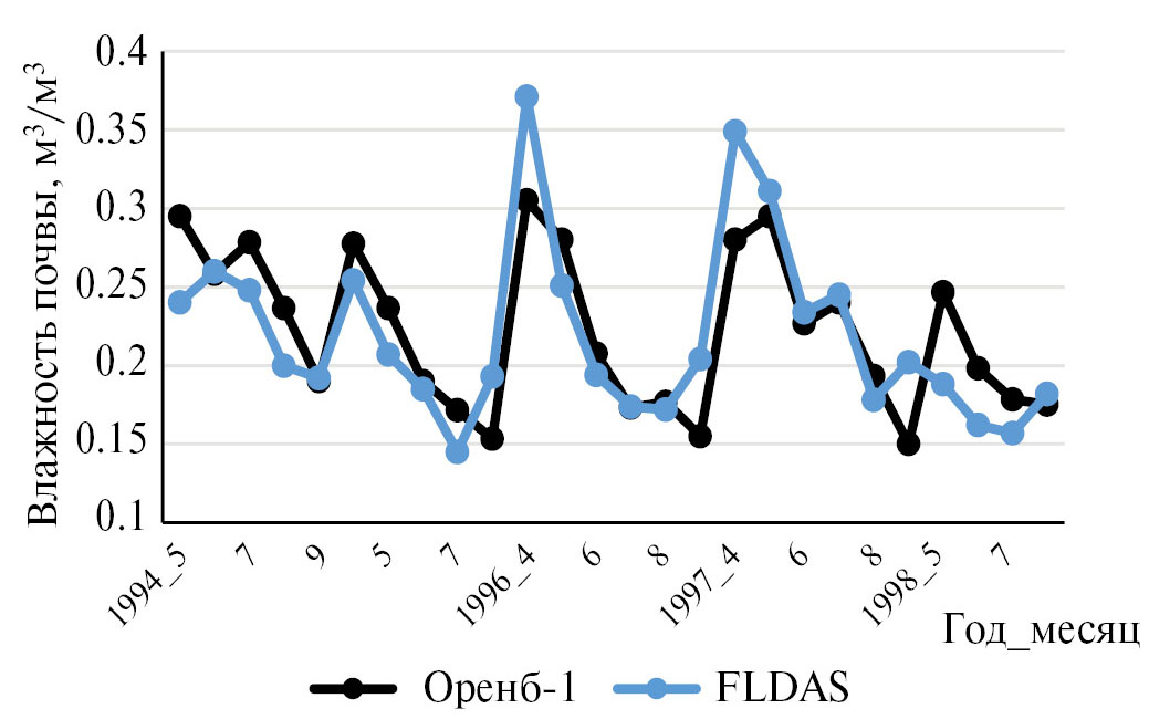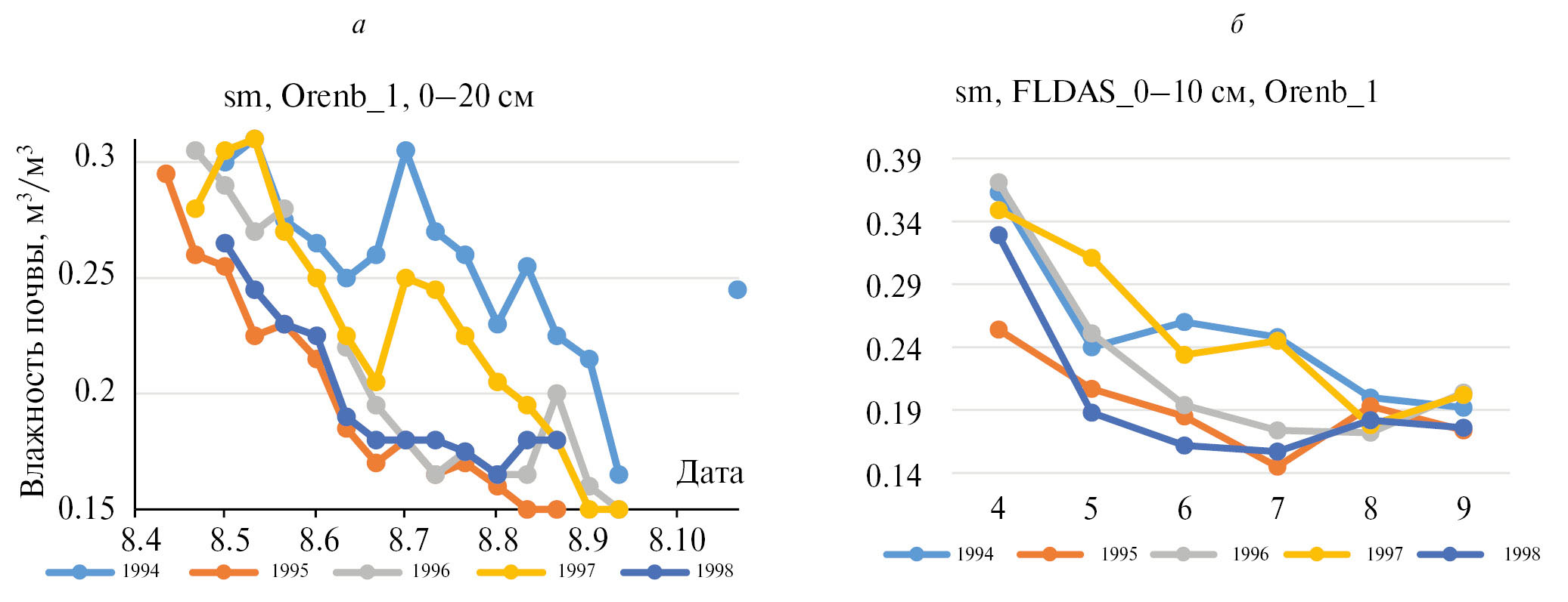 На рис. 7а приведены графики сезонных вариаций (три значения в месяц) наземных измерений влажности почвы на глубине 0–20 см на станции Orenburgskaya_#1 и на рис. 7б – графики среднемесячных значений ВП на глубине 0–10 см по модели FLDAS (продукт Model FLDAS_NOAH01_C_GL_M v001, ПР = 0.1°, усреднение по площадке с центром 52.15° с. ш., 55.05° в. д.) за 1994–1998 гг.