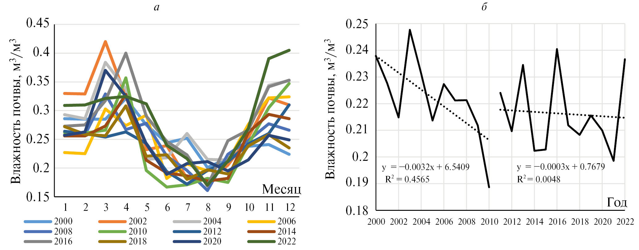 Рис. 9. Графики сезонных (а) и межгодовых (б) вариаций среднемесячных значений ВП на глубине 0–10 см для района Буртинской степи по модели FLDAS.