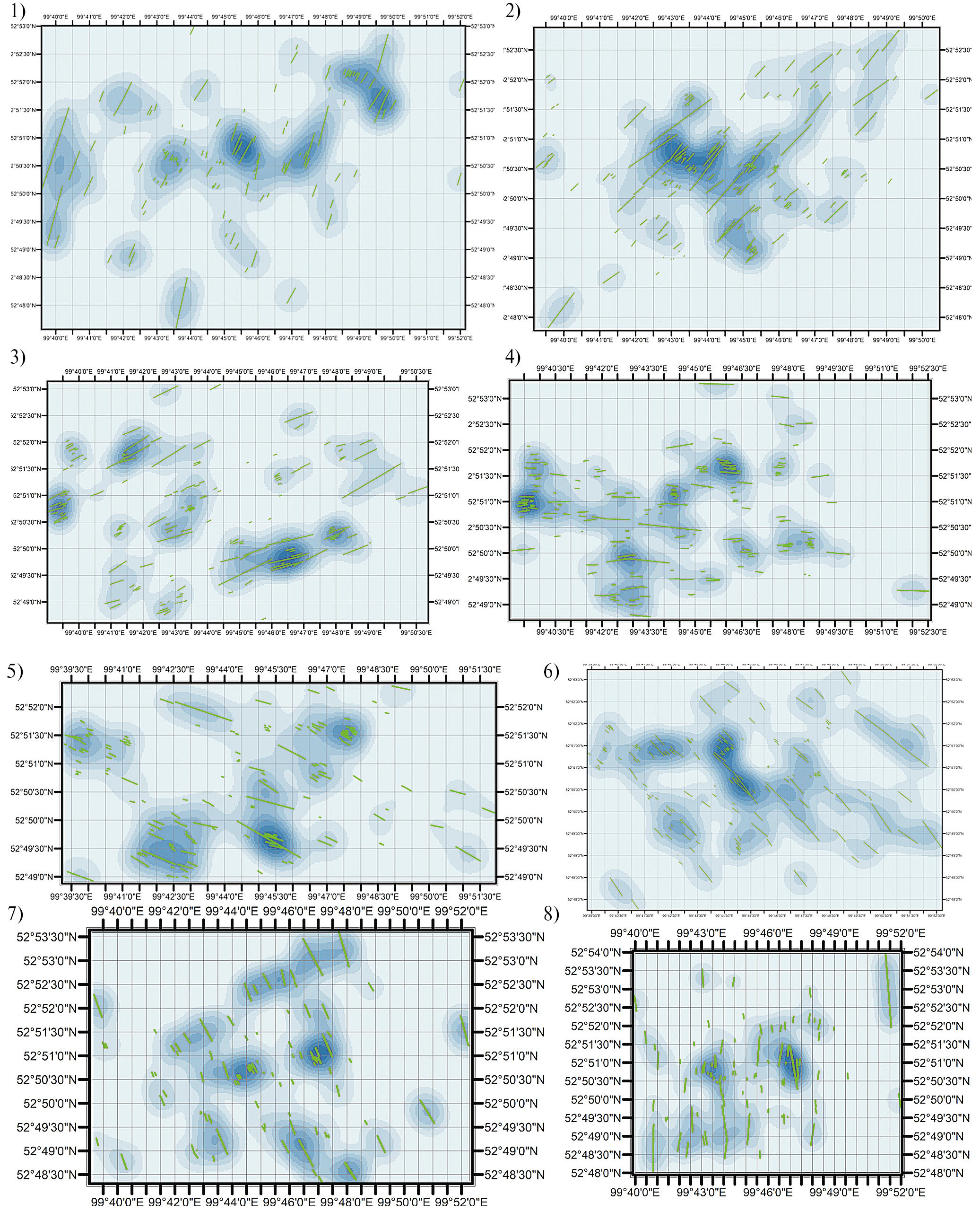 На основании выделенных при визуальном дешифрировании линеаментов, были построена карта их плотности, а затем, для проведения дальнейшего анализа результаты предыдущего этапа были сегментированы и для каждого отдельного сегмента линеаментов были высчитаны их азимут простирания (от 0° до 180°), на основании чего они были разделены на 8 групп, по которым построено 8 карт относительных плотности линеаментов с азимутами 22.5° ± 11.25°, 45° ± 11.25°, 67.5° ± 11.25°, 90° ± 11.25°, 112.5° ± 11.25°, 135° ± 11.25°, 157.5° ± 11.25° и 180° ± 11.25°(рис. 5).