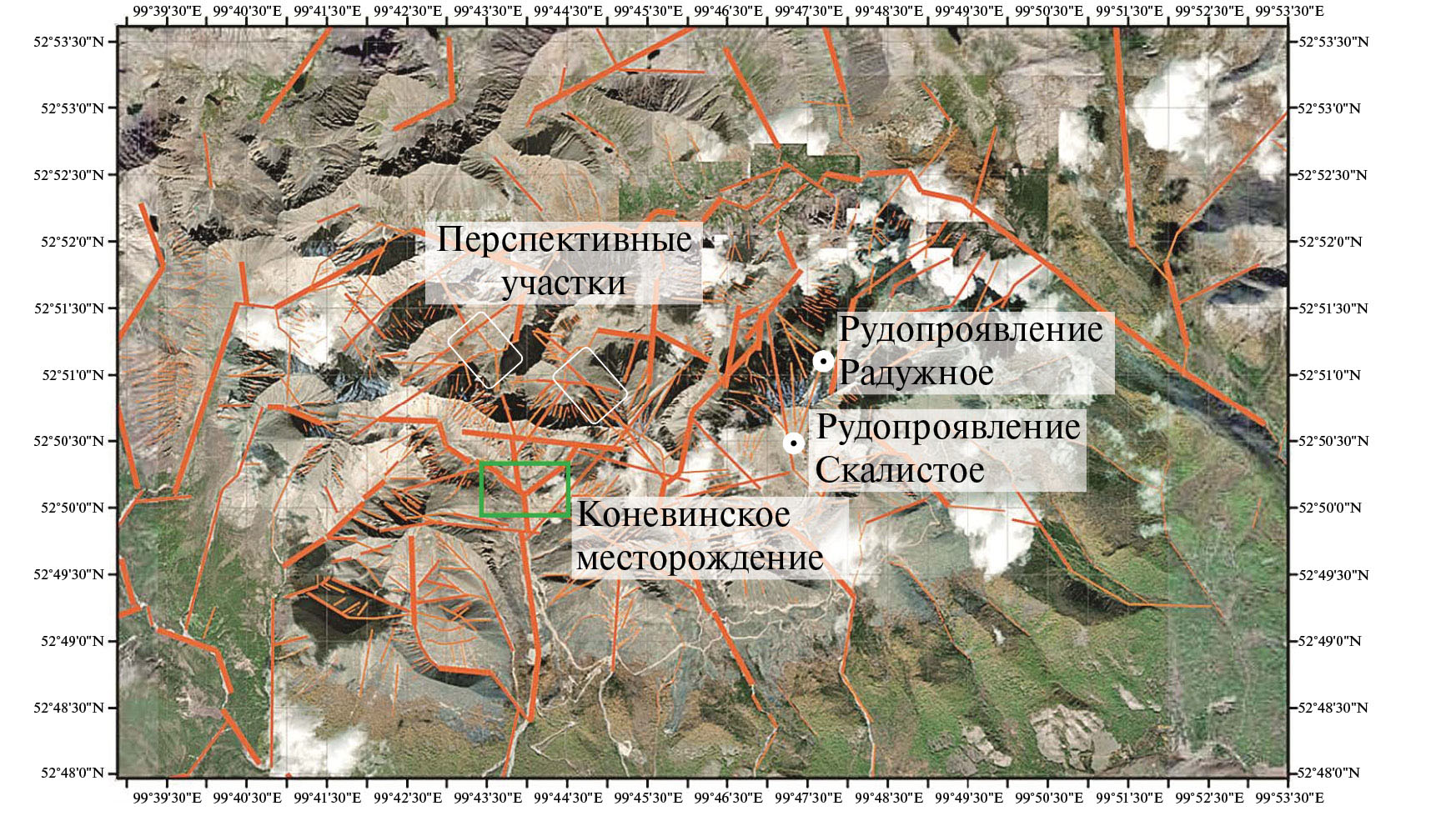 На основании полученных данных были сделаны выводы о приуроченности рудных тел, с одной стороны, к пересечениям крупных линеаментов рабочего масштаба, а, с другой стороны, приуроченности оруденения к определенному направлению, что позволяет делать предположения о перспективности участков, находящихся севернее Коневинского месторождения (рис. 8). Ранее поисковые работы были сосредоточены на востоке от месторождения и значимых результатов не дали.