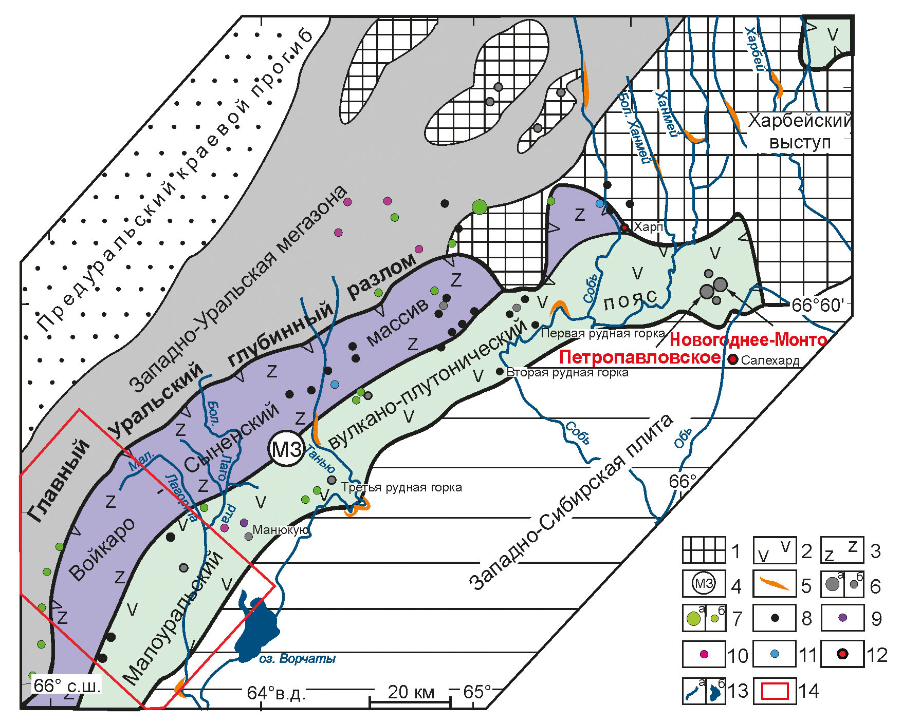Рис. 1. Схема Уральского складчатого пояса и положение изучаемой области в структурах Полярного Урала. Структурная основа по (Черняев и др., 2005) с изменениями: 1 – Центрально-Уральская мегазона, 2 – базальт-андезитовый комплекс, 3 – офиолиты, 4 – МЗ, 5 – россыпи золота; 6–7 – месторождения (а), рудопроявления (б): 6 – золоторудные и золотосодержащие; 7 – Cu-Zn-Mo; 8–11 – рудопроявления: 8 – Fe-Ti-V-Cu; 9 – Fe-Ti-Cu, 10 – Mo-Cu, 11 – Mo; 12 – населенные пункты; 13 – основные реки (а) и озеро (б), 14 – границы исследуемой территории.
