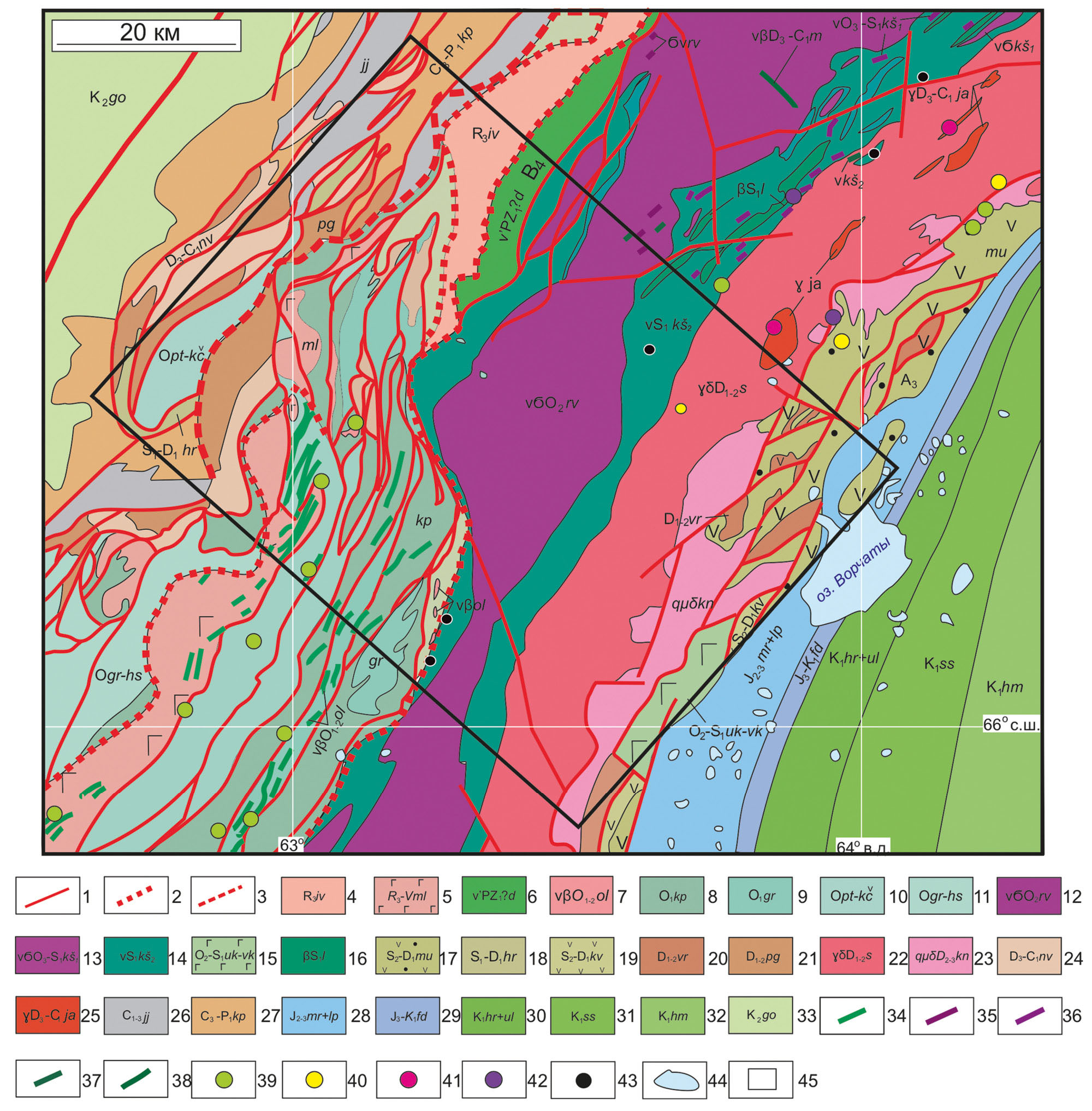 Рис. 2. Геологическая карта изучаемой территории по (Шишкин и др., 2007) упрощенная. Условные обозначения: 1–3 – разрывные нарушения достоверные: 1 – выходящие на поверхность, 2 – надвиг, 3 – шарьяж; 4 – хараматалоуская свита с чередованием графитоидно-кварцевых сланцев, графитоидных кварцитосланцев, слюдистых сланцев, кварцитов, эпидот-альбитовых амфиболитов, хлорит-альбитовых сланцев, гондитов; 5–6 – ультрамафит-метагабброноритовый дзеляюский комплекс с гипербазитами, габброноритами, амфиболитами; 7 – габбродолеритовый-абисальный орангьюганско-лемвинский комплекс с габбро-долеритами, долеритами, пикродолеритами, пикритами, дайками габбродолеритов; 8 – кокпельская свита с массивными и миндалевидными метабазитами, спилитами, алевролитами и аповулкагенными сланцами; 9 – грубеинская свита с алевролитами, филлитовыми сланцами и алевропесчаниками; 10 – нерасчлененные пагатинская, кибатинская и камчатская свиты с песчаниками, алевролитами известковистыми, алевритистыми известняками и петельчатыми известняками; 11 – грубеинская и харбейшорская свиты с лиловыми и зелеными алевролитами, филлитовыми сланцами, алевропесчаниками и песчаниками; 12 – дунит-гарбуцитовый с дунитами райизско-войкарский комплекс, дунит-гарбуцитовая ассоциация с сетчато-жильными и полосчатыми выделениями дунитов, нерасчлененные гипербазиты; 13–14 – кэшорский дунит-верлит-клинопироксенит-габбровый комплекс: 13 – первая фаза с дунитами, нерасчлененными верлитами, лерцолитами, 14 – вторая фаза с габбро, габброноритами, габбродиоритами, диоритами, дайками габбро; 15 – усть-конгорская и войкарская свиты нерасчлененные с подушечными и пластовыми спилитами, прослоями и линзами яшмоидов; 16 – лагортаюский комплекс с габбродолеритами, долеритами параллельных даек; 17 – малоуральская свита с туфами базальтов, разнообломочных андезибазальтов, базальтов, дацитов, прослои туфопесчаников, туффитов с линзами рифтогенных известняков; 18 – харотская свита с углисто-глинистыми сланцами, фтанитами, пачками петельчатых известняков на венлокско-лудловском и пражско-эмском уровнях; 19 – кевсоимская свита с трахиандезитами, трахитами и их туфами, конгломератами, гравелитами, песчаниками, яшмоидами и известняками, среднего состава с лавами; 20 – варчатинская свита с метабазитами, метаандезитами, метадацитами и их туфами, конгломератами, гравелитами, туфопесчаниками, туффитами, известняками; 21 – пагинская свита с песчаниками кварцевыми, алевролитами, аргиллитами, прослоями кремнисто-глинистых сланцев; 22 – диорит-тоналит-плагиогранитовый собский комплекс с гранодиоритами, тоналитами; 23 – монцогранодиоритовый конгорский комплекс с кварцевыми монцодиоритами плутоническими, кварцевыми монцодиоритами, гранодиоритами и диоритами; 24 – няньворгинская свита с алевроглинистыми, глинисто-кремнистыми, углисто-кремнистыми сланцами и фтанитами; 25 – гранитовый плутонический янославский комплекс с гранитами биотит-роговообманковыми, лейкогранитами и аляскитами; 26 – яйюская свита с граувакками, полимиктовыми песчаниками, известковистыми алевролитами, глинистыми сланцами, прослоями известняков и доломитами, 27 – кечпельская свита с мелкоритмичным переслаиванием полимиктовых мелкозернистых песчаников, алевролитов и аргиллитов; 28 – средняя юра, батский ярус – верхня