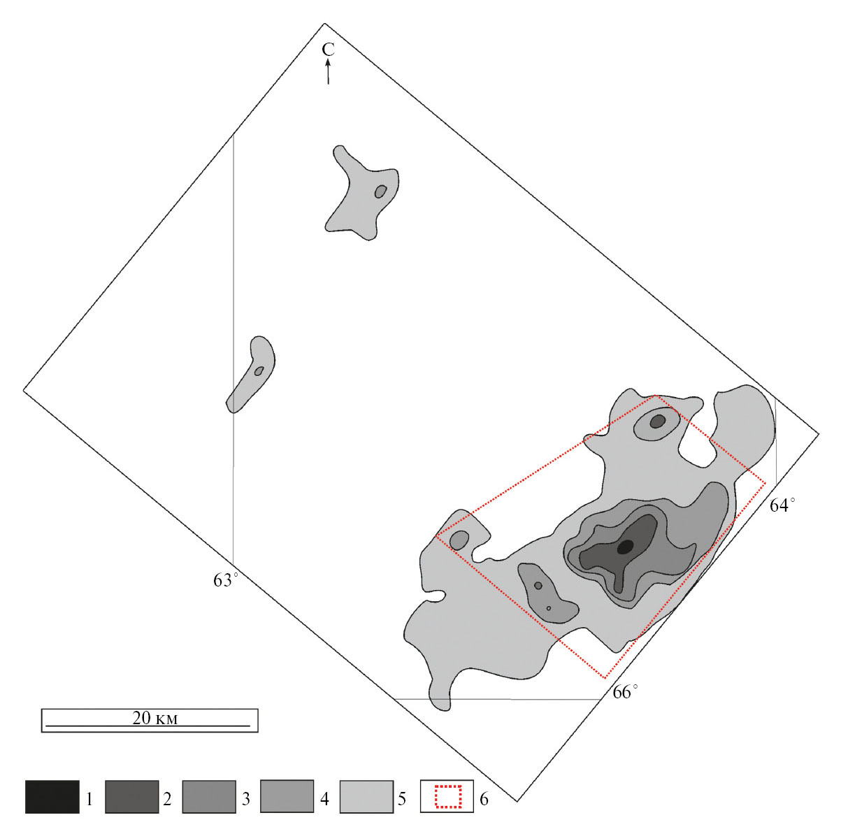Рис. 3. Прогнозная карта на золото-медно-порфировый тип оруденения. Условные обозначения: 1–5 – рисковые зоны (различные уровни вероятности обнаружения оруденения), 6 – рекомендованная область проведения оценочных работ. По мере увеличения насыщенности цветов возрастает степень вероятности прогноза золото-медно-порфировой минерализации.