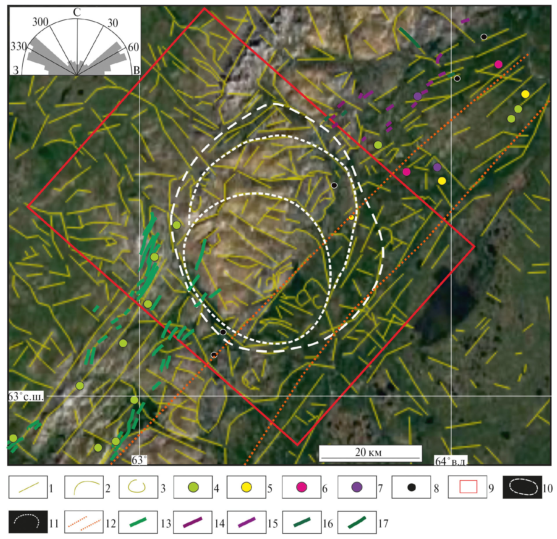 Линеаментный анализ широко используется для структурных исследований (Abdullah et al., 2010; Thannoun, 2013), выделения оставшейся морфологической системы кальдер (Verdiansyah, 2017, Verdiansyah, 2019), оценки перспектив минерализации (Hubbard et al., 2012) и др.