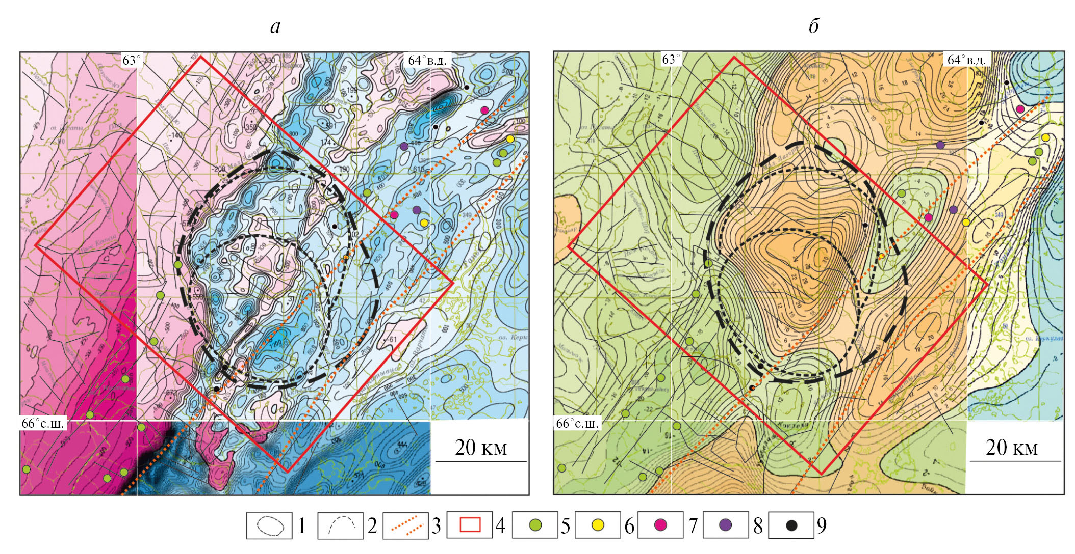 Геофизические данные включали карты магнитного поля и гравитационных аномалий, масштабы 1:200000 (Шапорев и др., 1986). Интерпретация геофизических полей проводилась с целью подтверждения и уточнения внешних контуров морфоструктур и структурных элементов.
