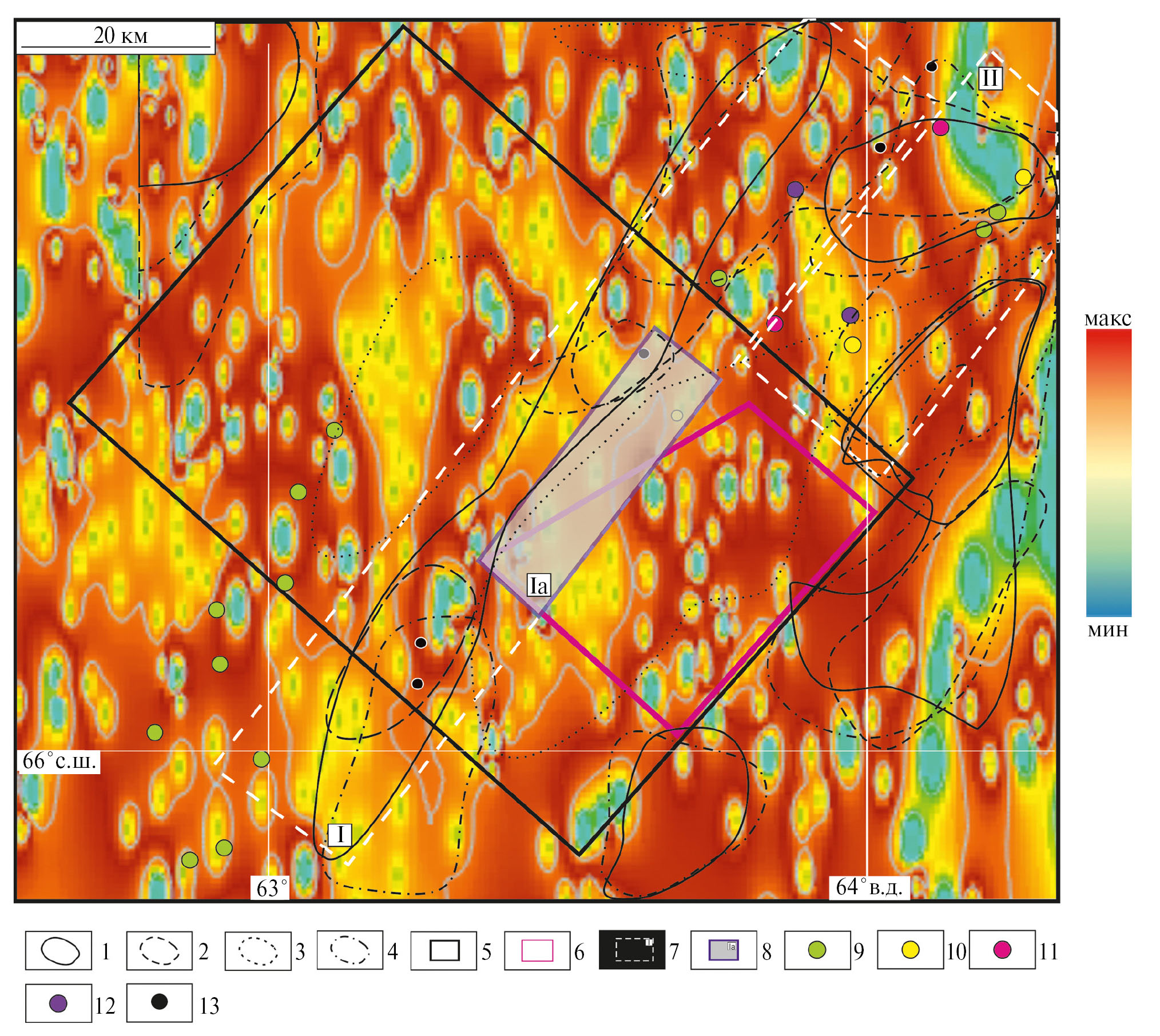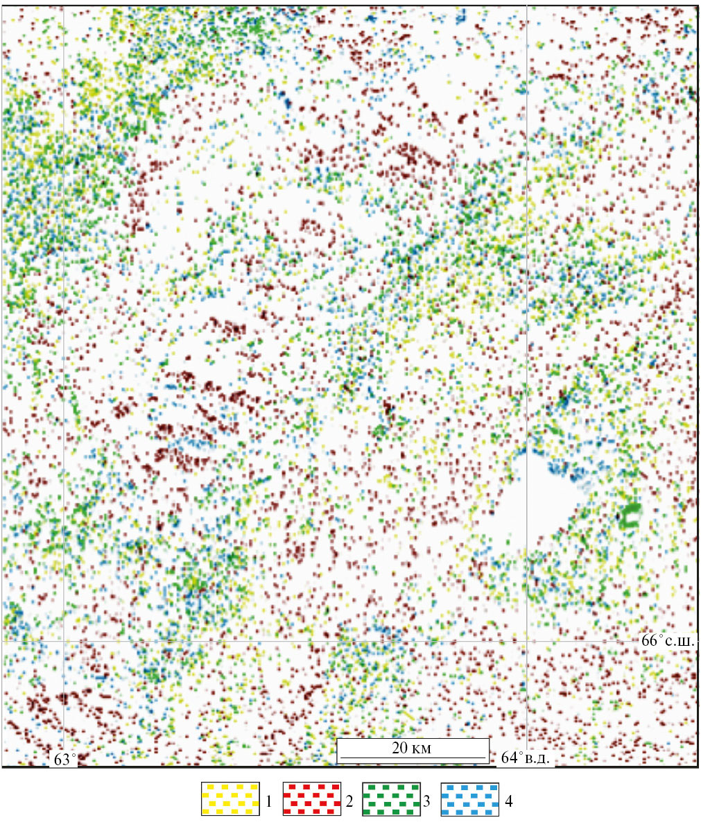 Геологическая информация представлена в виде геологической карты дочетвертичных образований, карты ПИ и закономерностей их размещения (см. рис. 2) (масштабы карт 1:200000, листы Q-41-XV, XVI, XVII, XXI, XXII), составленных в рамках госзадания ВСЕГЕИ в 2005 г. (Кучерина и др., 1991, Овечкин и др., 1999, Шишкин и др., 2007, Мельгунов и др., 2008, Галиуллин и др., 2009).