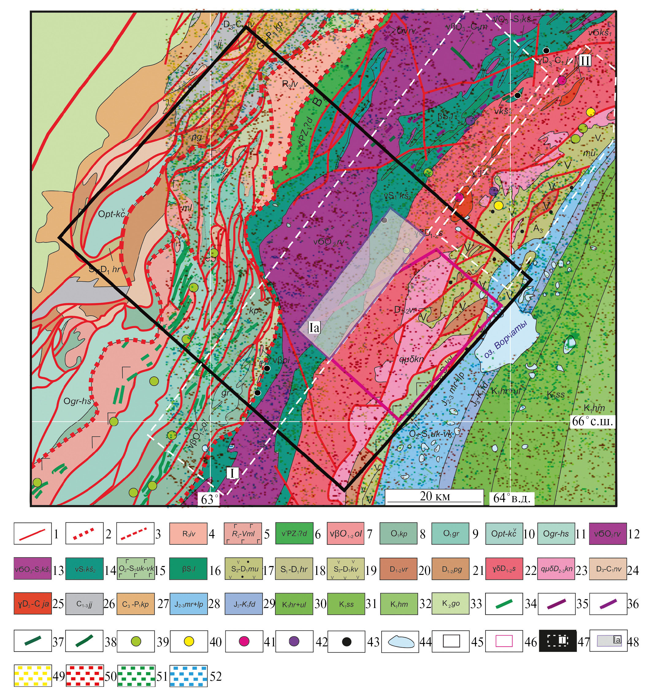 Изучаемая площадь состоит из пород комплексов и свит, принадлежащих следующим основным рудным районам: Войкаро-Сынинский хромитовый, Кэшорский платино-золото-меднорудный и Малоуральский медно-молибден-железорудный.