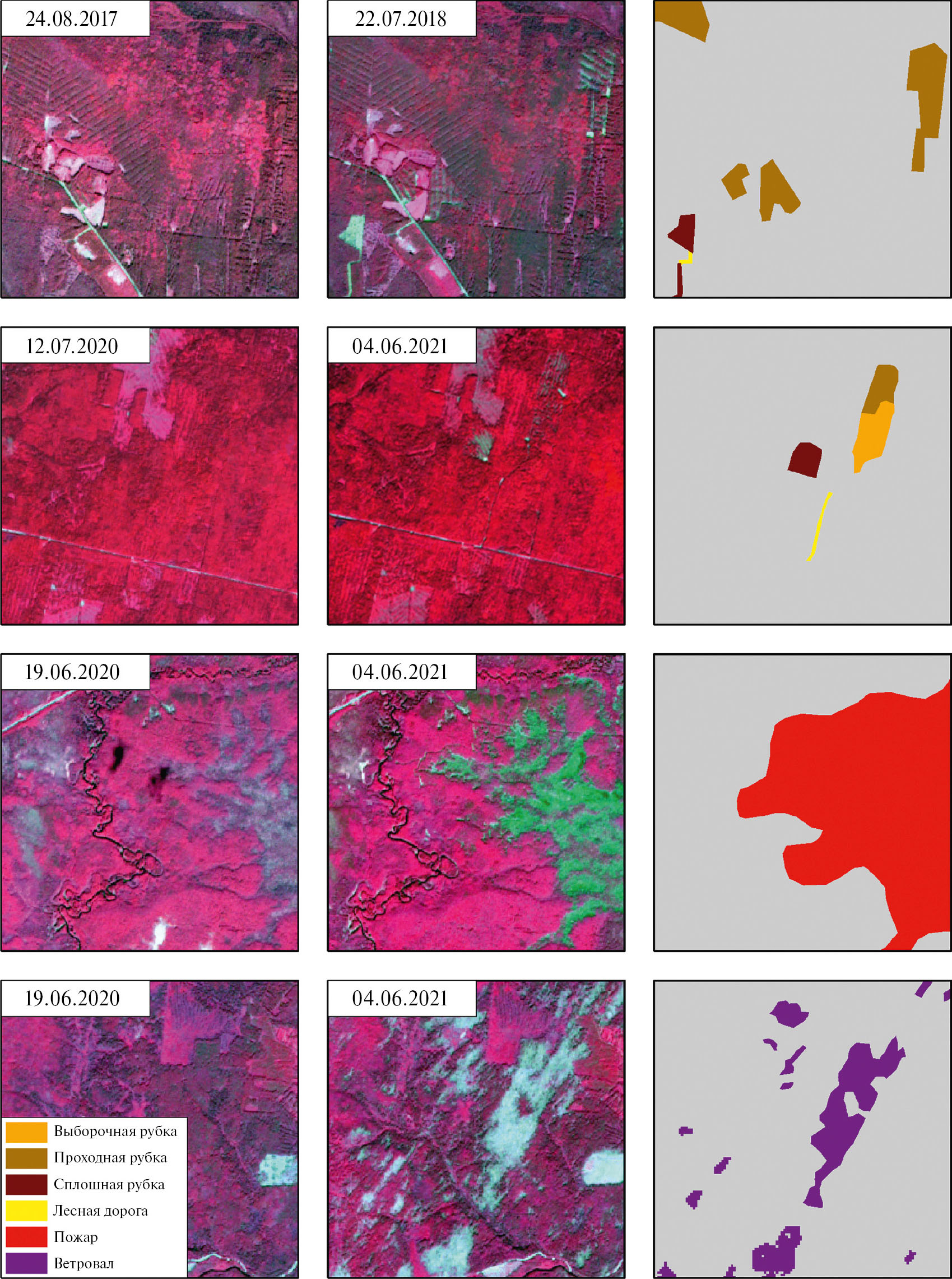 Рис. 1. Примеры размеченных данных о нарушениях лесного покрова для обучения СНС.