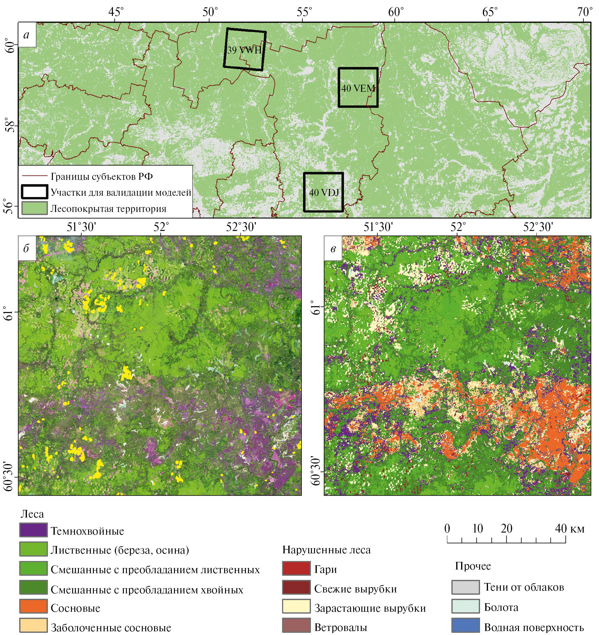 Основной валидационный набор данных также был создан в ходе ранее опубликованной работы (Канев и др., 2022). Вырубки и ветровалы размечены на трех тестовых участках, которые представляют собой ячейки глобальной разграфки данных Sentinel-2 с идентификаторами T40VDJ, T40VEM и T39VWH. Они расположены на территории Пермского края и Республики Коми и существенно различаются по доле лесопокрытой территории, преобладающим породам в древостое и характеру лесопользования (рис. 2а). Для каждого участка выбраны по 4 безоблачных сцены Sentinel-2, полученные с интервалом около полугода (зимние и летние безоблачные снимки 2021 и 2022 гг.). По разновременным снимкам были оцифрованы нарушения лесного покрова, появившиеся за этот период (всего 1796 вырубок на общей площади 14695 га и 779 участков ветровалов на общей площади 1323 га). Для каждой вырубки также определен тип (сплошная, проходная, выборочная рубка или лесная дорога).