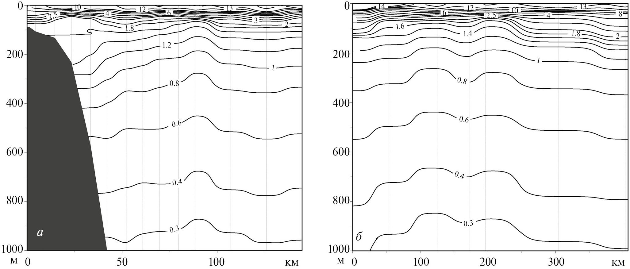 На рис. 7в, г отчетливо видно, что нулевые изотахи разделяют западный и восточный потоки в районе расположения вершины апвеллинга и хребта Васильковского. Отсюда связанный с глубинным апвеллингом циклонический круговорот, расположенный в области ЗЦК, является крупным топографическим вихрем, сформированным, вероятно, при взаимодействии набегающего потока с положительными формами рельефа дна (Козлов, Дарницкий, 1981; Зырянов, 1995; Дарницкий, 2010) ‒ хребтами Васильковского, Берсенева и возвышенностью Первенец. Большая часть западного прибрежного потока – Приморского течения обтекает поднятия с севера, образуя северную периферию КЦК и ее западной структуры ЗЦК. В структуре топографического вихря выделяются два небольших по размеру циклонических вихря, центры которых связаны с двумя вершинами глубинного апвеллинга на рис. 4б, в. Эти вершины выделяются и в распределении температур на северо-восточном разрезе на рис. 5б. Один вихрь формируется над хребтами Васильковского и Берсенева, второй располагается между возвышенностью Первенец и хребтом Берсенева (рис. 4б, в и 6а, б). Экспериментальное выявление топографического фактора в формировании циклонического круговорота и апвеллинга в западной части КЦК пришлось на осенний и зимний сезоны. На данный момент отсутствуют аналогичные исследования в весенне-летний период, что не позволяет сделать однозначные выводы о соотношении факторов циклонической завихренности и топографии в происхождении глубинного апвеллинга и сезонной изменчивости его местоположения.