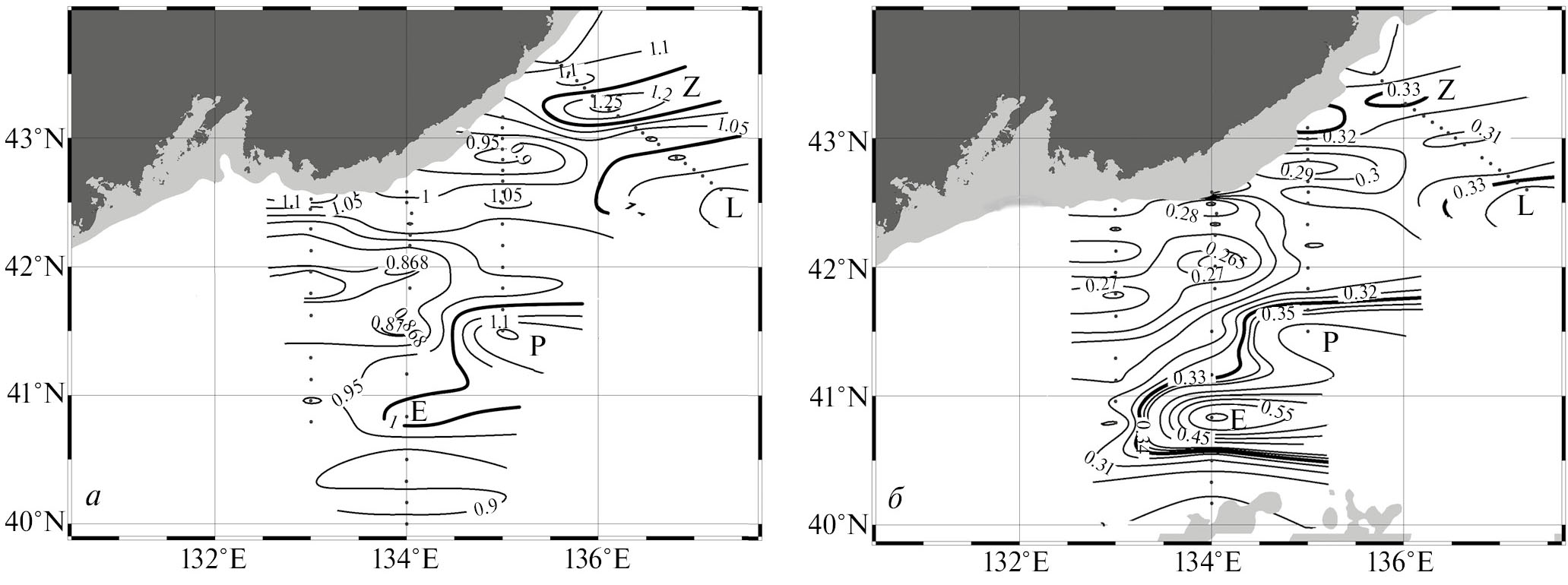 Другой примечательной особенностью глубинного апвеллинга является то, что вытянутая с юго-запада на северо-восток центральная область подъема глубинных вод, распространяясь все дальше на северо-восток до 135.5° в.д. и отклоняясь все более в сторону побережья в направлении залива Ольги, примерно совпадает с зоной дивергенции, отмеченной ранее (Яричин, Покудов, 1982; Яричин, 1982; Юрасов, Яричин, 1991), также отклоняющейся к побережью в направлении залива Ольги, как и зона апвеллинга. Эту дивергенцию (Васильев, Макашин, 1991) по результатам диагностического расчета интегральной циркуляции связывают с подъемом вод в области циклонической завихренности. На рис. 4б, в и 6а, б структура поля температуры в виде замкнутых изотерм в районе 42° с.ш. свидетельствует не только об апвеллинге, но также о нахождении здесь циклонического круговорота. Наличие циклонической циркуляции в районе работ над подводными поднятиями дна подтверждается распределением зональных составляющих геострофической скорости на разрезах по 134° в.д. (рис. 7в, г). Особенностью распределения зональных составляющих геострофической скорости на разрезах является ее повышенные значения в области расположения антициклона в южной половине разреза на рис. 7а, что наглядно свидетельствует о роли вихрей в увеличении скорости течений в глубинном слое моря.
