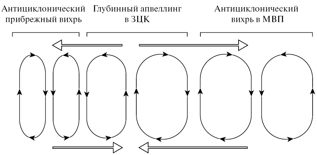 В декабре-феврале в субарктической зоне моря в верхнем слое наблюдается интенсификация КЦК (Takematsu et al., 1999a; Kang et al., 2000; Трусенкова и др., 2007; Таранова и др., 2018) и, соответственно, входящих в него круговоротов, что обуславливается положительными значениями завихренности касательного напряжения ветра и усилением ветров северных румбов от осени к зиме. Усиление циклонических круговоротов приводит к интенсификации апвеллингов, связанных с круговоротами, в верхнем слое. В тоже время тесное взаимодействие круговоротов и вихревых поясов должно сказаться и на динамике входящих в пояса вихрей. В рамках гипотезы о вихревой природе интенсификации глубинной циркуляции (Hogan, Hurlburt, 2000) в северной половине моря в зимний период возможная интенсификация вихрей – это только часть механизма увеличения скорости глубинных вод от октября к марту. Интенсификация круговоротов в зимний период, приводя к усилению апвеллингов в верхнем слое, также усиливает вертикальную и поперечную горизонтальную циркуляцию, в частности, в ЗЦК. На рис. 10 представлена упрощенная схема вертикальной циркуляции на разрезе по 134° в.д. в декабре 2021 г., построенная на основе распределения температуры на рис. 7а. Структура вертикальной циркуляции на разрезе, пересекающем ЗЦК и антициклонический вихрь МВП с юга, а также небольшой антициклонический вихрь между побережьем и ЗЦК с севера, представляет собой совокупность циркуляционных ячеек. Ячейки охватывают всю водную толщу разнонаправленной вертикальной и поперечной горизонтальной циркуляцией, формирующей в верхнем слое ЗЦК и антициклонических вихрей, соответственно, зоны дивергенции и конвергенции вод, а в нижнем слое, соответственно, зоны конвергенции и дивергенции. На рис. 10 видно, что усиление апвеллинга в верхнем слое будет усиливать конвергенцию вод в нижнем слое, увеличивая скорость течения. Это усиление с мористой стороны от ЗЦК осуществляется через антициклонический вихрь, который, распространяясь до дна, деформирует придонный конвективный слой и область апвеллинга в поле температуры (рис. 7а). С компенсационным вихревым потоком энергии и массы воды из верхних слоев в глубинные в условиях усиливающегося от осени к зиме глубинного апвеллинга связан, вероятно, наибольший вклад в интенсификацию глубинной циркуляции в районе Японской котловины в зимний период. Характер же интенсификации монотонное увеличение средней скорости глубинных вод от минимума в октябре до максимума в марте (Choi, Yoon, 2010) определяется, вероятно, особенностью развития вертикальной и поперечной горизонтальной циркуляции, которое происходит постепенно по мере накачки вихревой энергии и компенсационного потока вышележащих вод в глубинные слои в течение всего зимнего периода в условиях идущего усиления северо-западных ветров к февралю-марту до смены зимнего муссона на летний.