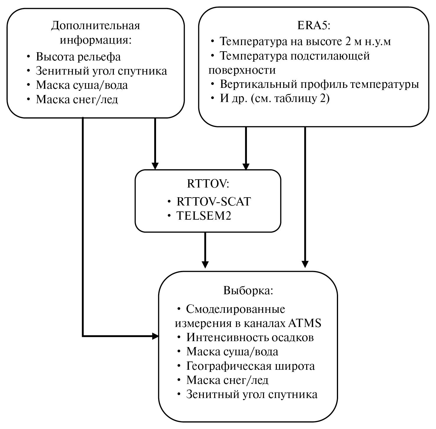 В настоящее время существует широкий выбор радиационных моделей для расчета излучения на верхней границе атмосферы в каналах спутникового прибора. На практике используют модели двух типов: быстрые модели, адаптированные к различным спутниковым микроволновым радиометрам, например, RTTOV или CRTM, и модели, основанные на точных полинейных расчетах, например, ARTS или LBLRTM. В рамках настоящей работы для моделирования излучения в каналах прибора ATMS использовалась быстрая радиационная модель RTTOV v13 (в частности RTTOV-SCATT). RTTOV позволяет проводить моделирование измерений с более чем 80 спутниковых приборов, работающих от микроволнового до видимого диапазона длин волн, и поддерживается операционными научными центрами по всему миру (Geer et al., 2021). Данная модель переноса излучения способна моделировать микроволновое излучение от облаков и осадков с достаточно высокой точностью (Barlakas et al., 2022). Для моделирования микроволнового излучения, рассеянного облаками и осадками, в RTTOV используются модели переноса излучения с многократным рассеянием, включающим эффекты рассеяния несферическими частицами, например, лед, снег, град и др. (Liu, 2008; Eriksson et al., 2018). Программная реализация RTTOV имеет открытый исходный код и гибкий интерфейс пользователя, что позволяет исследователям настраивать функционал работы модели под свои научные задачи.