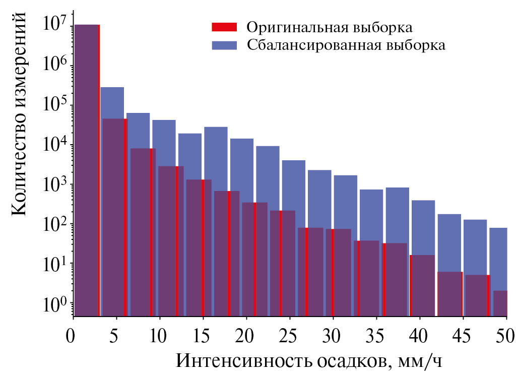 Какая бы большая и полная выборка не была, стоит учитывать ситуации, когда наблюдается дисбаланс данных. В случае интенсивностей осадков такая ситуация может привести к тому, что нейросеть будет предсказывать, например, хорошо малые интенсивности, но плохо – большие. Если предположить, что интенсивность осадков может быть разделена на следующие классификации: слабые (0.25 – 2.5 мм/ч), умеренные (2.5 – 8 мм/ч), сильные (8 – 15 мм/ч) и очень сильные (> 15 мм/ч) (Zhao et al., 2020), то ОВ, построенная на расчетах RTTOV, будет иметь более 95% всех интенсивностей, относящихся к классу слабых осадков. Это приведет к тому, что интенсивности умеренных и сильных осадков будут иметь наибольшую погрешность при обучении нейронной сети. Если попытаться выровнять численность умеренных и высоких интенсивностей относительно малых, то картина будет противоположная – ошибки обучения малых интенсивностей возрастут. Таким образом, перед обучением нейронной сети необходимо акцентировать внимание на том, какой класс осадков точнее всего нужно восстанавливать. В рамках настоящего исследования было принято решение перебалансировать ОВ таким образом, чтобы нейросеть больше фокусировалась на слабых и умеренных интенсивностях осадков. На рис. 3 представлено распределение интенсивностей осадков до и после балансировки классов.