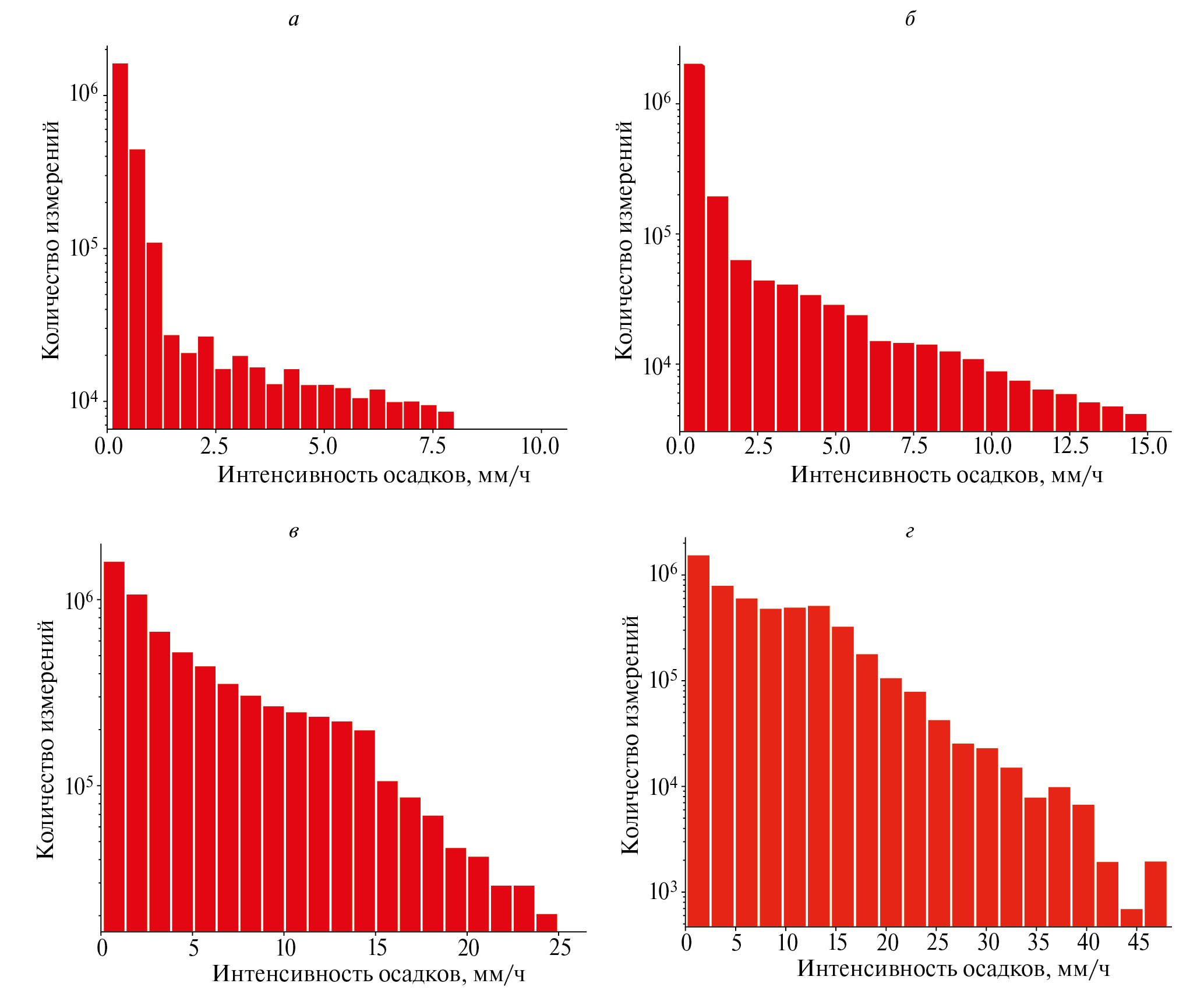 Рис. 4. Распределение интенсивности осадков в обучающей выборке по классам интенсивности осадков: а ‒ слабые; б ‒ умеренные; в ‒ сильные; г ‒ очень сильные.