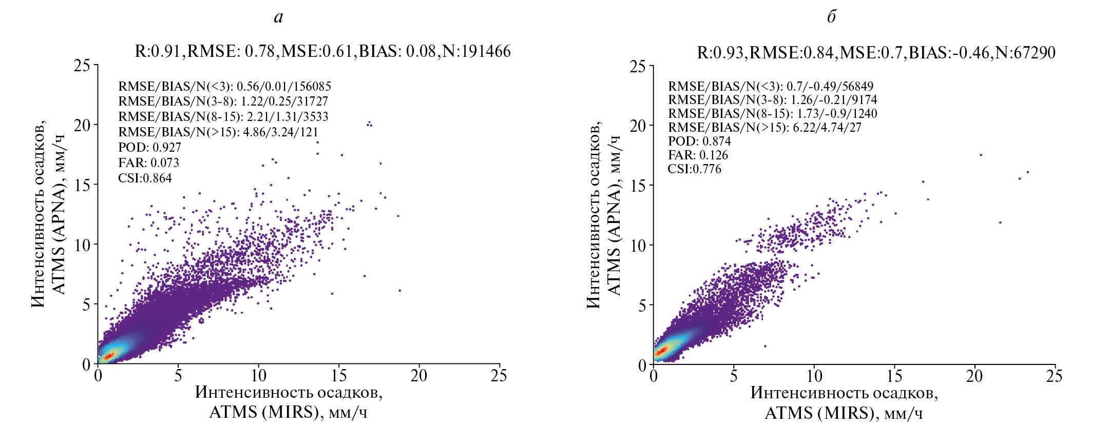 Рис. 5. Диаграммы рассеяния для значений интенсивности осадков по данным MIRS и APNA для воды (а) и для суши (б).