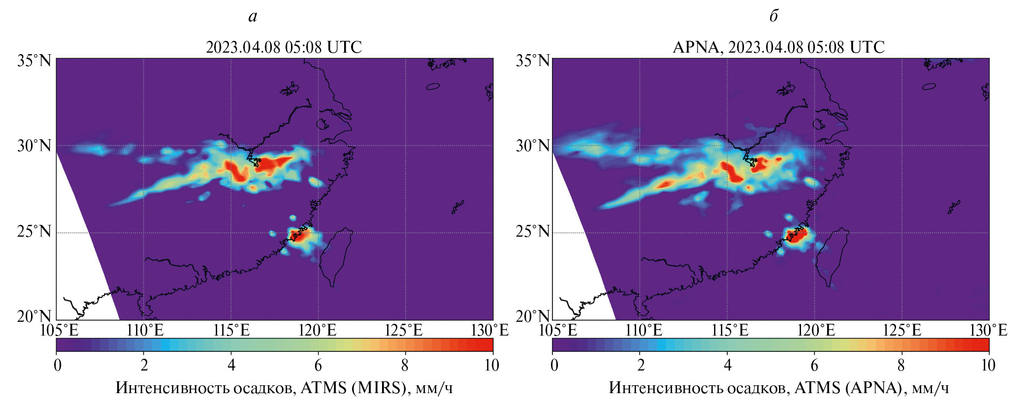 Рис. 6. Интенсивность осадков по данным MIRS (a) и APNA (б).