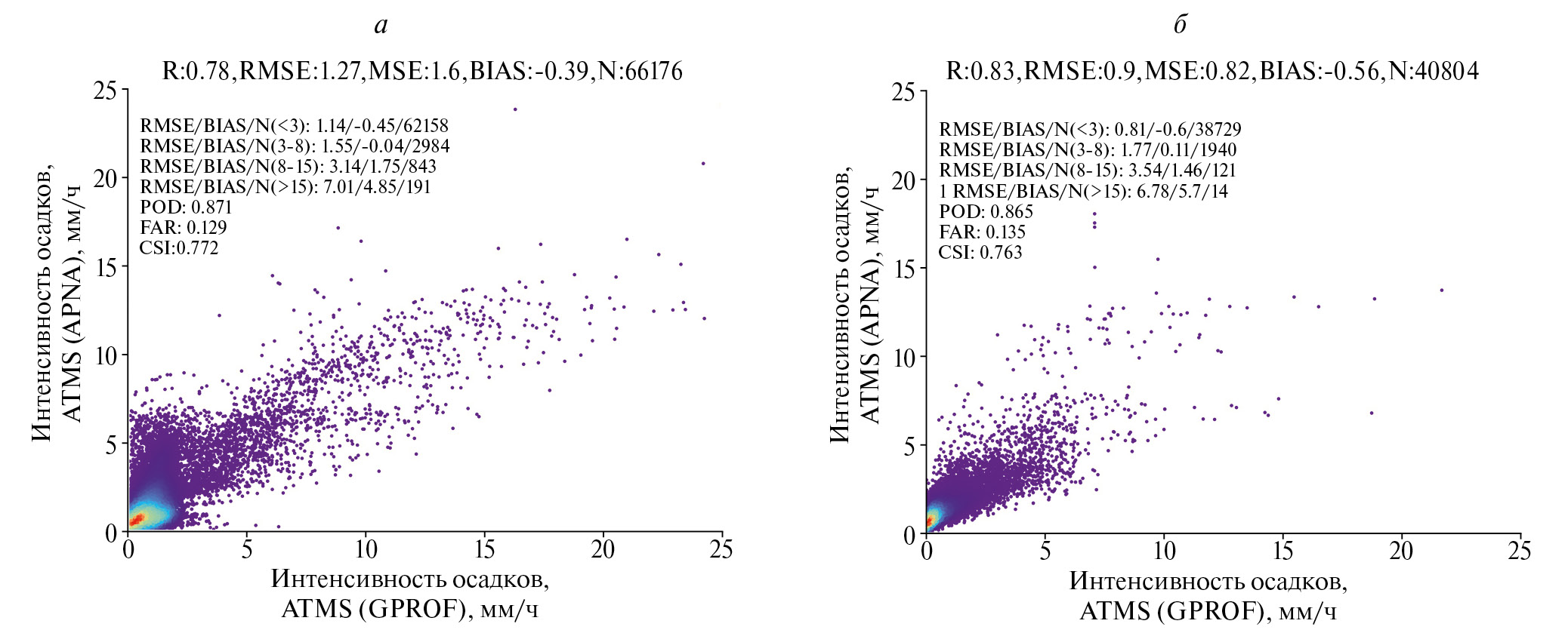 Рис. 7. Диаграммы рассеяния для значений интенсивности осадков по данным GPROF и APNA для воды (а) и для суши (б).