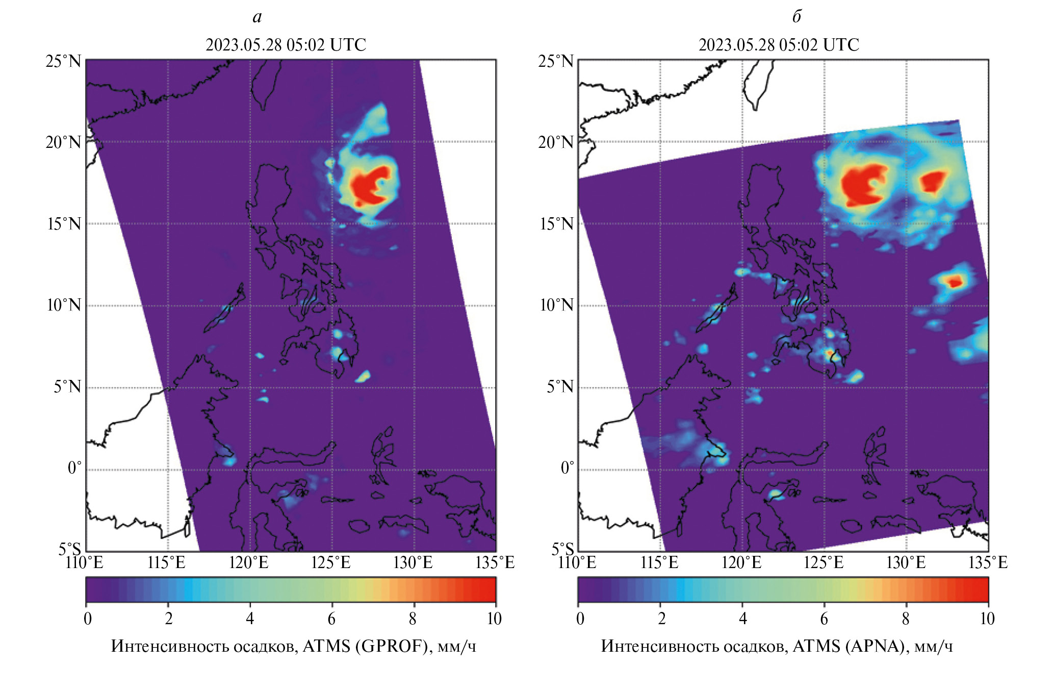 Рис. 8. Интенсивность осадков по данным GPROF (a) и APNA (б).