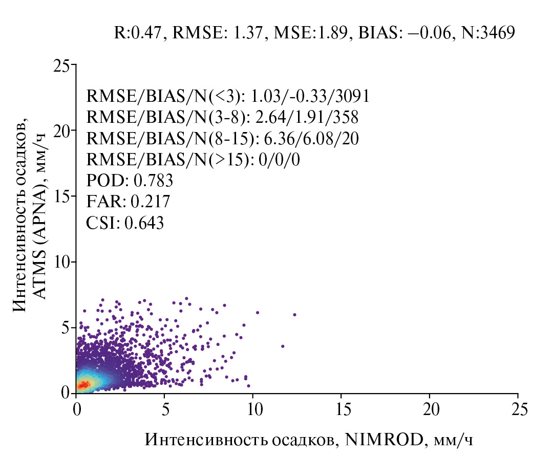 Рис. 9. Диаграмма рассеяния для значений интенсивности осадков по данным NIMROD и APNA.