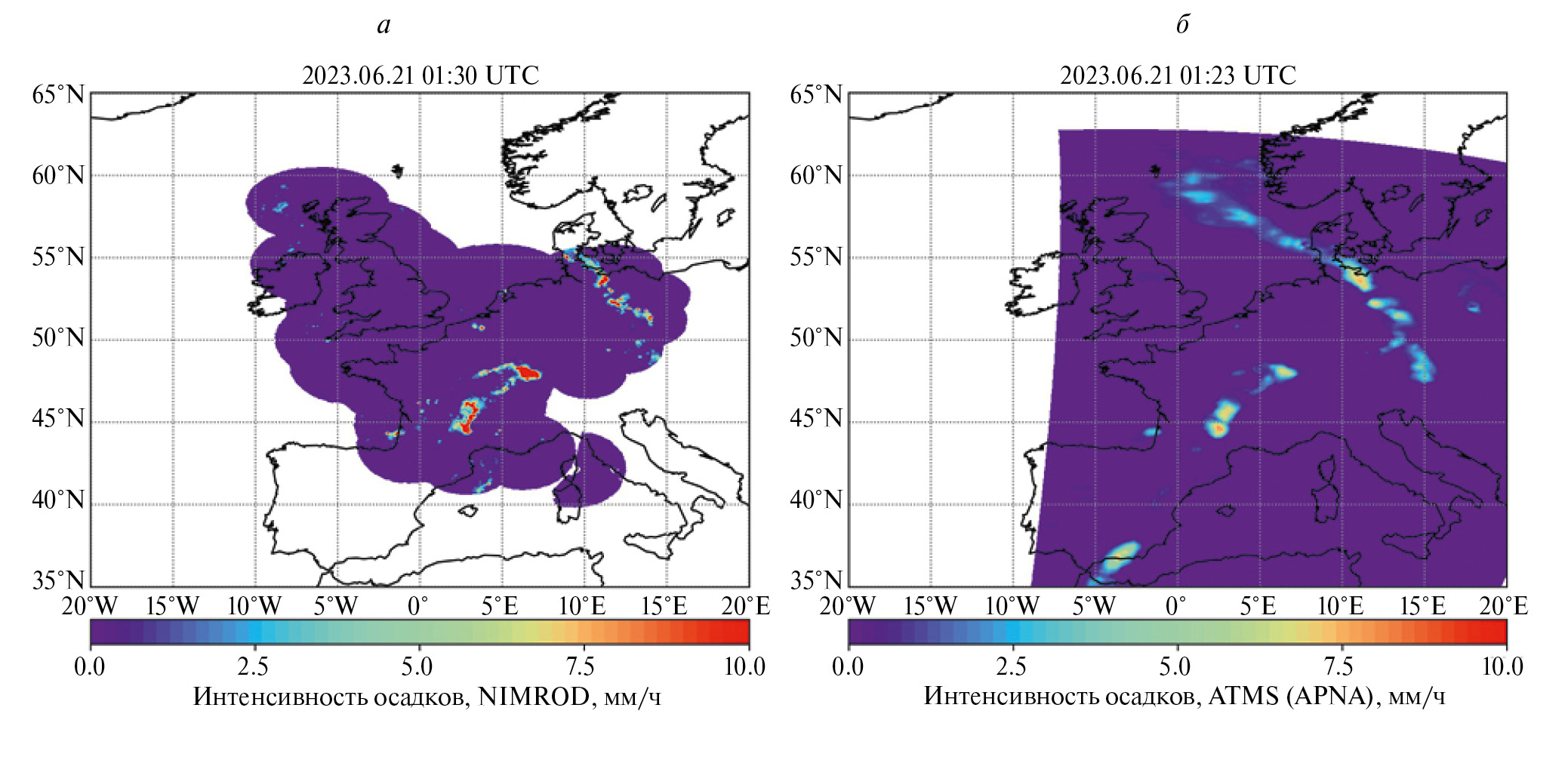 Рис. 10. Интенсивность осадков по данным NIMROD (a) и APNA (б).