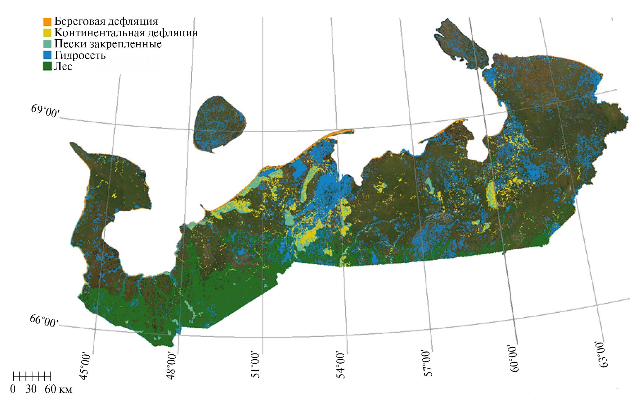 Выделение участков открытых песков, лишенных растительности и в первую очередь подверженных дефляции на территории Ненецкого автономного округа, проведено с использованием актуальной космической съемки высокого разрешения спутников Канопус 2В, Landsat 8, 9 и архивных снимков сверхвысокого разрешения спутника WorldView 3. На основе дешифрирования полученных цветосинтезированных по каналам RGB изображений установлено современное распределение и проведена векторизация границ участков дефляции как в прибрежной зоне, так и в континентальной части (Кулик и др., 2020).