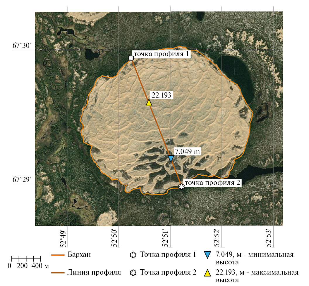В табл. 2 приведены геометрические и геоморфологические характеристики тестового участка континентальной дефляции в зоне субарктической поймы, которые показывают, что гряды имеют типичную серповидную форму, вытянутую по направлению преобладающих в теплое время года ветров северного румба, высота гряд достигает 19 м от подножия, при крутизне более 20°. При его площади более 355 га условный диаметр составляет более 1.9 км. Полученные данные свидетельствуют о развитии процессов дефляции песчаных массивов на территории исследований. Особенностью таких массивов является присутствие по периферии и в межгрядовых понижениях древесной растительности, представленной березово-еловыми (Picea obovata, Betula tortuosa) редколесьями и небольшими лесными массивами с куртинами лиственницы сибирской (Larix sibirica Ledeb.) и подлеском из ив и ерника (Betula nana, Salix glauca, Salix phylicifolia). Травянистая растительность представлена видами Carex ensifolia ssp. Carex Arctisibirica, Саrех fuliginosa ssp. misandra, Саrех vaginata, Сагех ledebouriana, Oxytropis maydelliana Trautv и др. (Александрова, 1977).