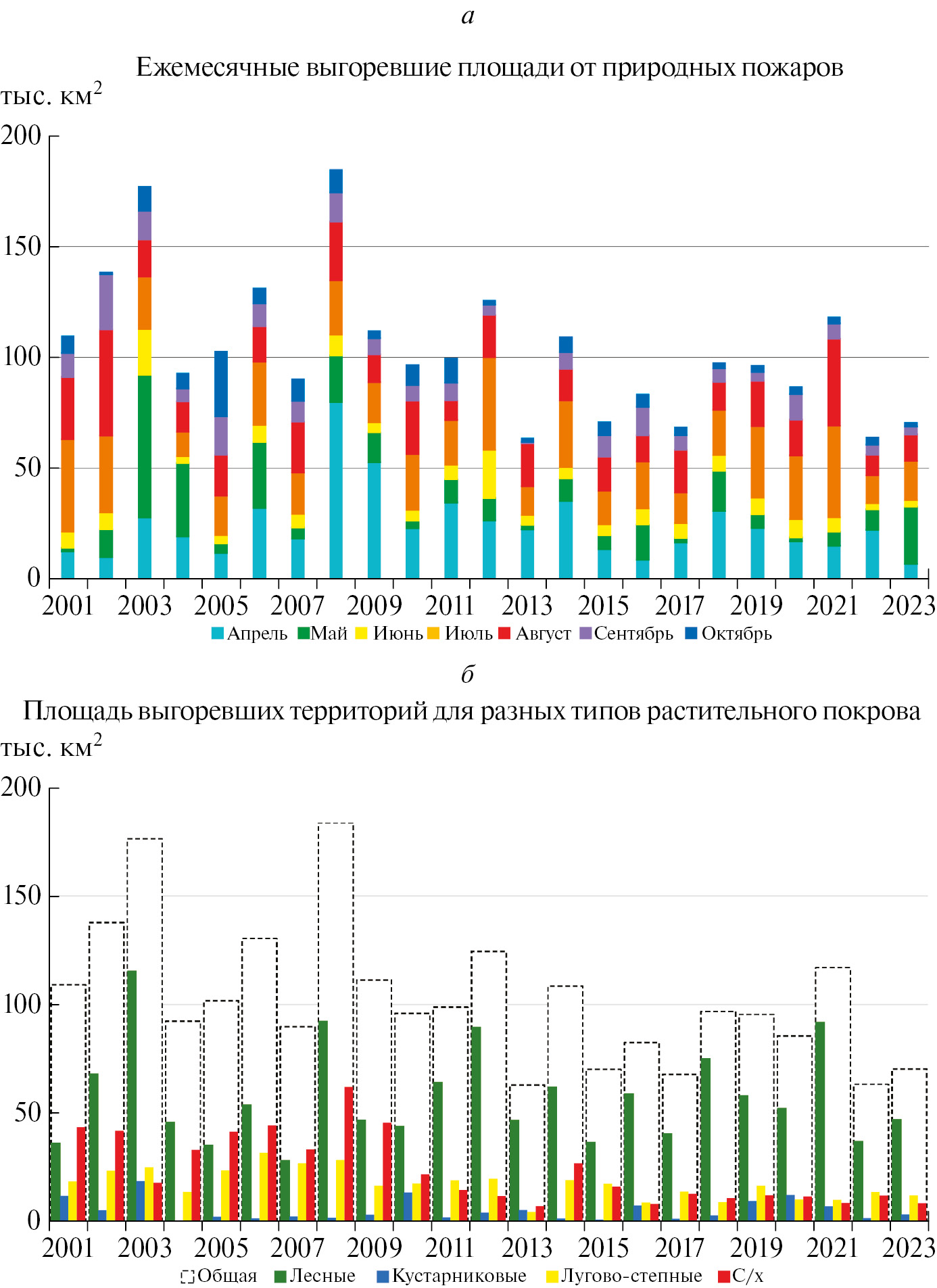 На рис. 1а представлены распределения по годам площадей выгоревших участков для каждого месяца (показаны различными цветами) в пожароопасные периоды (апрель- октябрь) за эти годы. На рис. 1б показаны распределения по годам площадей, пройденных огнем, при различных типах пожаров (выделены разными цветами: лесные – зеленым, кустарниковые – синим, лугово-степные – желтым, сельскохозяйственные палы – красным). Пунктирными столбиками на рис. 1б показаны общие площади для всех типов пожаров за каждый год в период с 2001 по 2023 гг.