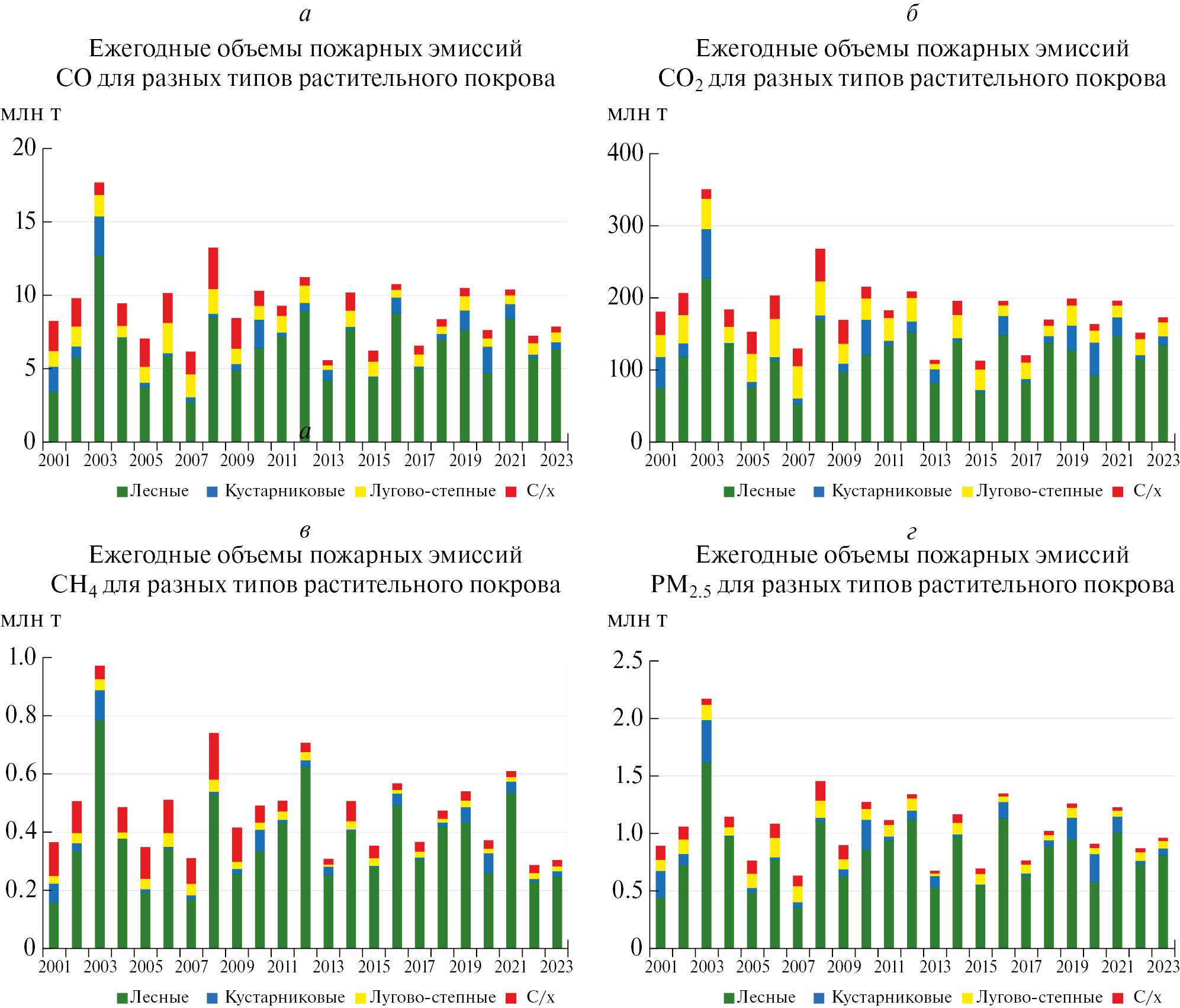 На рис. 4 приведены ежегодные объемы пожарных эмиссий отдельно для каждого из углеродсодержащих газов СО(а), СО2(б), CH4(в), и мелкодисперсных аэрозолей PM2.5 (г) для разных типов пожаров на всей территории России.