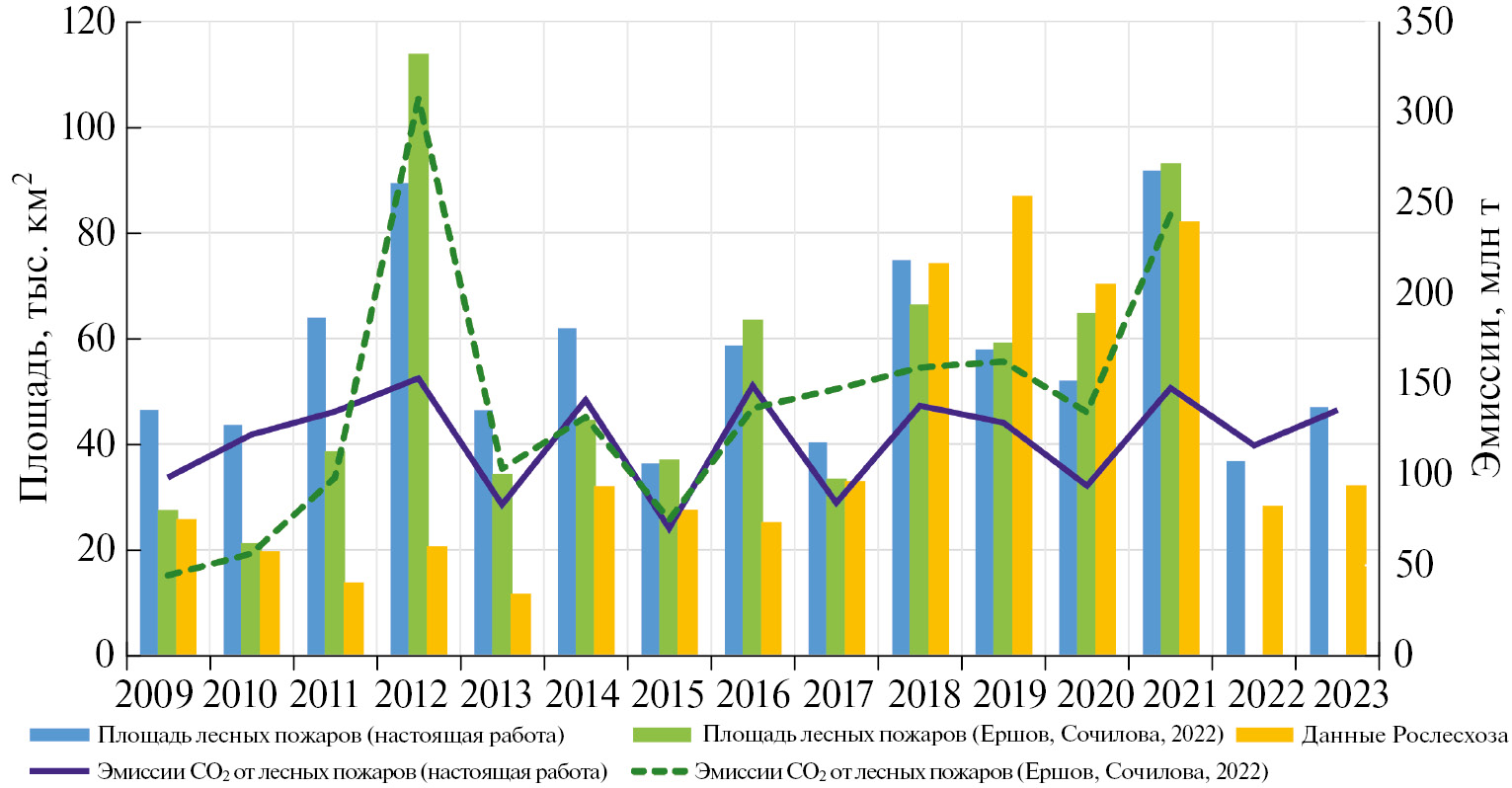 На рис. 5 приведено более подробное сравнение оценок площадей лесных пожаров (синие столбцы) и годовых объемов эмиссий углекислого газа CO2 (синяя линия) с 2009 по 2023 годы, полученные в настоящей работе, с данными Федерального агентства лесного хозяйства России (Рослесхоз) о площадях лесных пожаров (желтые столбцы), полученные в тот же период времени (https://www.fedstat.ru/indicator/38496), а также с данными о площадях лесных пожаров (зеленые столбцы) и объемах эмиссий CO2 (зеленая пунктирная линия) за период времени с 2010 по 2020 годы, приведенные в работе (Ершов, Сочилова, 2022).