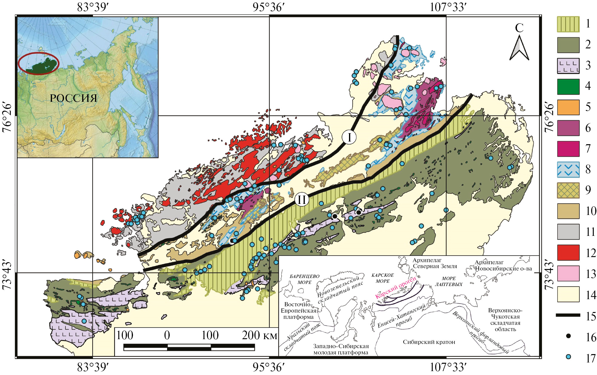 Рис. 1. Схематическая тектоническая карта Таймыро-Североземельского орогена (составлена по материалам (Верниковский и др., 2022; Государственная…, 2009; 2011; 2013; 2014; 2015; 2020). 1–2 – южный домен – Южно-Таймырская складчатая зона (деформированная пассивная континентальная окраина Сибирской платформы): 1 – преимущественно доломиты и известняки (O–C2); 2 – преимущественно песчаники, аргиллиты, угленосные отложения (C3–P2); 3–5 – деформированные образования траппов (P3–T1): 3 –базальты и туфы, 4 – долеритовые силлы, 5 – щелочные сиениты, граниты, монцониты; 6–11 – центральный домен – Центрально-Таймырский аккреционный пояс: 6 – кратонные террейны, 7 – неопротерозойские гранитоиды (940–850 млн. лет), 8 – преимущественно островодужные комплексы (NP1), 9 – террейны карбонатных комплексов, 10 – осадочный чехол (NP3–C1), 11 – северный домен – деформированные и метаморфизованные породы пассивной континентальной окраины Карского микроконтинента: ритмично переслаивающиеся метапесчаники, метаалевролиты, другие метапелиты, углистые сланцы (NP3–Є); 12 – синколлизионные граниты; 13 – постколлизионные граниты; 14 – отложения юрско-четвертичного возраста, включая Енисей-Хатангский прогиб; 15 – главные разломы: I – Главный Таймырский-Диабазовый, II – Пясино-Фаддеевский; 16 – месторождения металлических полезных ископаемых (коренные); 17 – рудопроявления металлических полезных ископаемых.