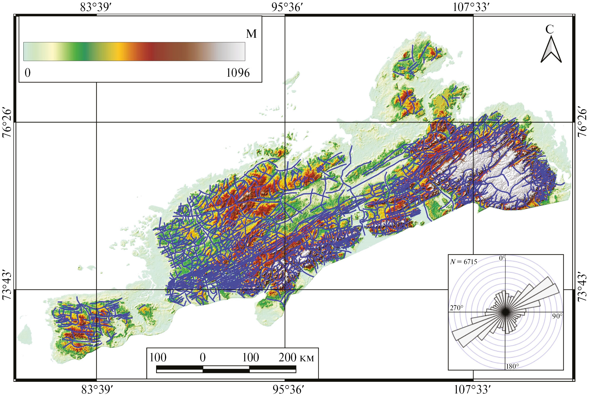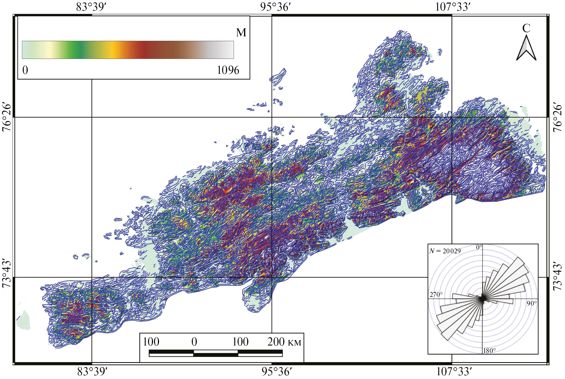 Важно отметить, что в целях повышения однородности результатов линеаментного анализа обе блок-зоны были урезаны в северо-восточной области. Дело в том, что северо-восточная часть Главной Таймырско-Диабазовой блок-зоны в значительной степени перекрыта отложениями юрско-четвертичного возраста, а северо-восточная область Пясино-Фаддеевской блок-зоны представлена северо-восточным окончанием гор Бырранга, где обширное горное плато, которому принадлежат наибольшие высотные отметки для изучаемой территории, резко погружается под четвертичные прибрежно-морские осадки приморской низменности (см. рис. 1). Эти обстоятельства в значительной степени ограничили возможность выделения линеаментов ручным способом в северо-восточной части Таймыро-Североземельского орогена (см. рис. 3).