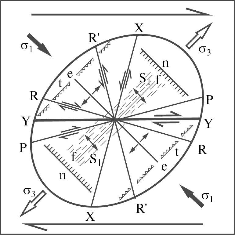 Рис. 4. Системы эшелонированных структурных элементов, образующихся в сдвиговой разломной зоне при простом скалывании (Hancock, 1985): Y – магистральный сдвиг, R и R’ – сопряженные сколы Риделя, X, P – вторичные сдвиги, e – отрывы, n – сбросы, t – взбросы, f – складки, S1 – кливаж, σ1 – ось максимального сжатия, σ3 – ось максимального растяжения.