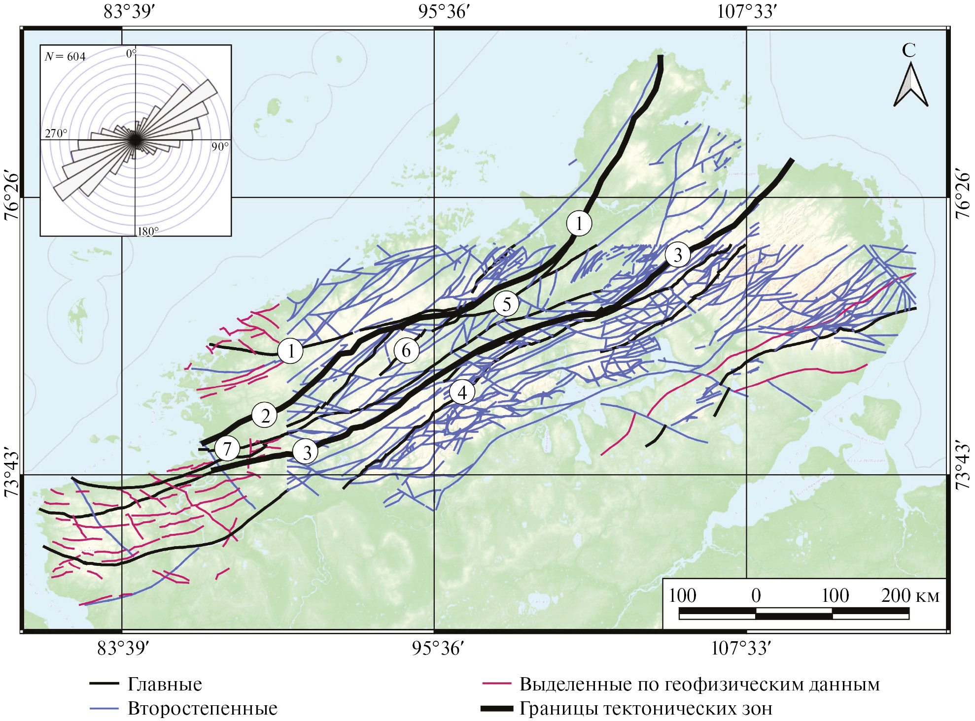 Рис. 6. Схема пространственного распределения разрывных нарушений Таймыро-Североземельского орогена по материалам государственных геологических карт масштаба 1:1 000 000, и роза-диаграмма их ориентировок. Разломы: 1 – Главный Таймырский; 2 – Диабазовый; 3 – Пясино-Фаддеевский; 4 – Пограничный; 5 – Мамонтово-Ярский; 6 – Чукчинский; 7 – Северо-Пясинский. N – количество разломов.