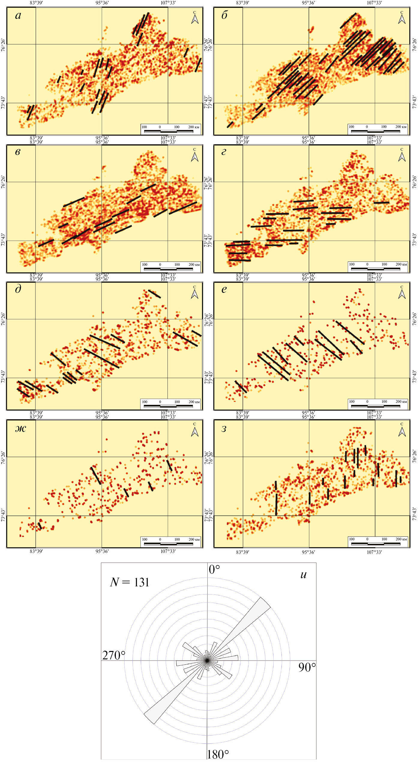 На обобщенной розе-диаграмме трендов линеаментов (см. рис. 7и) явно выделяются система северо-восточного простирания, а также две менее развитые системы – северо-западная и субширотная.