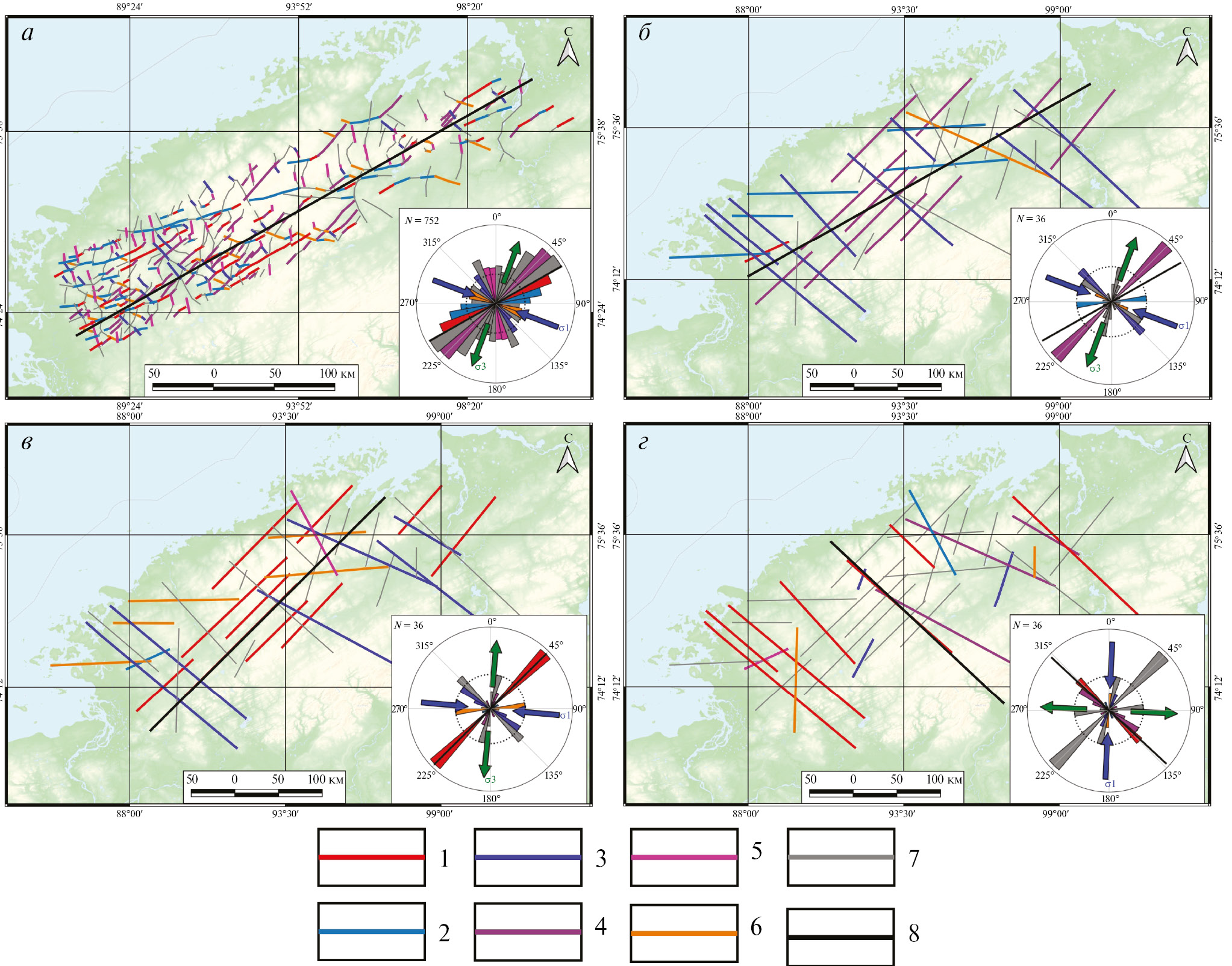Рис. 8. а–г – Реконструкция ПНД для Главной Таймырско-Диабазовой блок-зоны на основе модели П.Л. Хэнкока для: протяженных линеаментов, выделенных вручную (а); трендов плотностей линеаметов: с линией сдвига, проведенной согласно трассе разлома (б); с линией сдвига, проведенной согласно преобладающей системе вторичных сколов (в); г – с линией сдвига, проведенной согласно северо-западной системе трендов линеаментов. 1 – Y-трещины; 2 – R-трещины; 3 – R’-трещины; 4 – P-трещины; 5 – X-трещины; 6 – T-трещины; 7 – не определено; 8 – “тренд” разлома (линия сдвига). Синие стрелки – ориентировка оси максимального сжатия; зеленые стрелки – ориентировка оси максимального растяжения. N – количество объектов, использованных для построения розы-диаграммы.