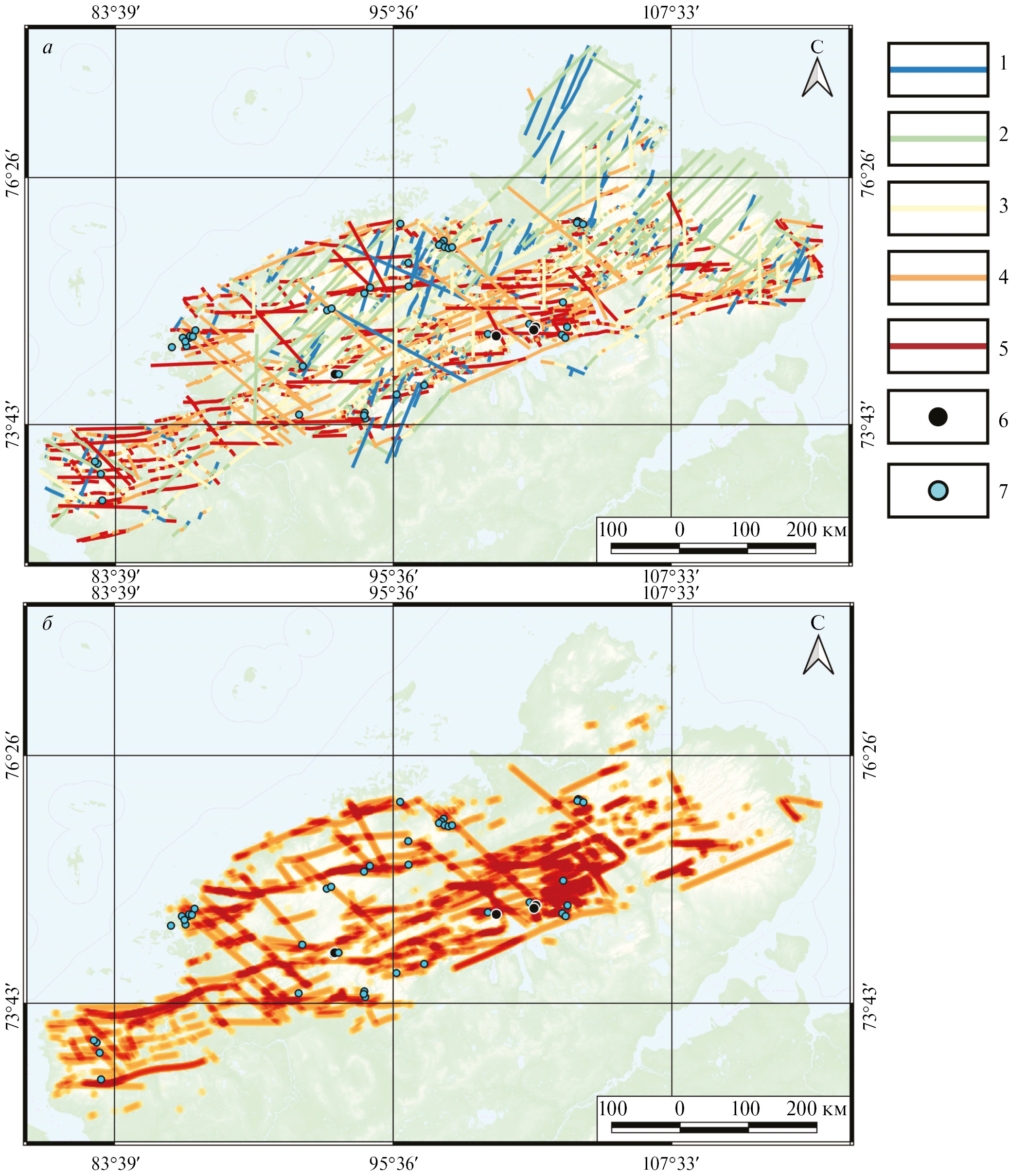 Рис. 10. Результаты реконструкции гидравлической активности сегментов тектонических элементов: а – классифицированные сегменты всей разломной сети Государственной геологической карты и трендов плотностей линеаментов; б – схема зон влияния (оранжевые линии) сегментов разломов и сегментов трендов плотностей линеаментов проницаемых и повышенной проницаемости. Участки перекрытия зон влияния нескольких разломов окрашены красным. 1 – непроницаемые сегменты; 2 – слабопроницаемые сегменты; 3 – сегменты средней проницаемости; 4 – проницаемые сегменты; 5 – сегменты повышенной проницаемости, 6 – гидротермальные месторождения металлических полезных ископаемых; 7 – гидротермальные рудопроявления полезных ископаемых.