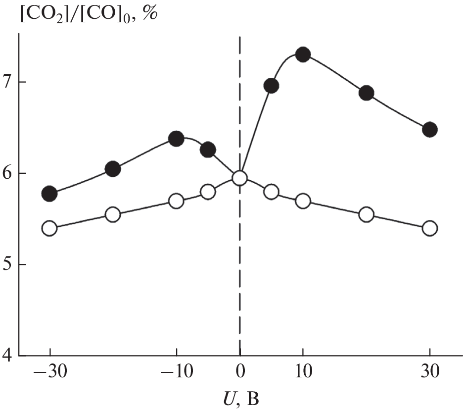 Measurements are reported of the increase in catalytic CO oxidation rate on gold nanocoatings obtained by applying a positive or negative electrical voltage of variable magnitude to a coating. In experiments on an initial mixture of 1.8% СО + 10.2% О2 + Ar and a coating with a starting particle size of 0.2 to 3 nm, conducted at 430°C and atmospheric pressure, the extent of the CO oxidation rate enhancement caused by a stepwise increase in the applied positive voltage initially amounts to 28% at +10 V and then declines to 20% at +30 V. Applying a negative voltage has a weaker effect: after an initial increase by 12% at –10 V, the extent of the enhancement of the CO oxidation rate declines to 7% at –30 V. Quantum chemical calculations are performed to determine the heats of association for CO and O2 with the simplest electrically neutral or electrically charged Au3 cluster, as well as the heats of the reaction for Au3CO + O → Au3CO2 and Au3CO2 → Au3 + CO2 involving differently charged Au3 complexes. Based on the calculated results, an explanation is proposed for the increased catalytic CO oxidation rate on electrically charged gold nanocoatings.