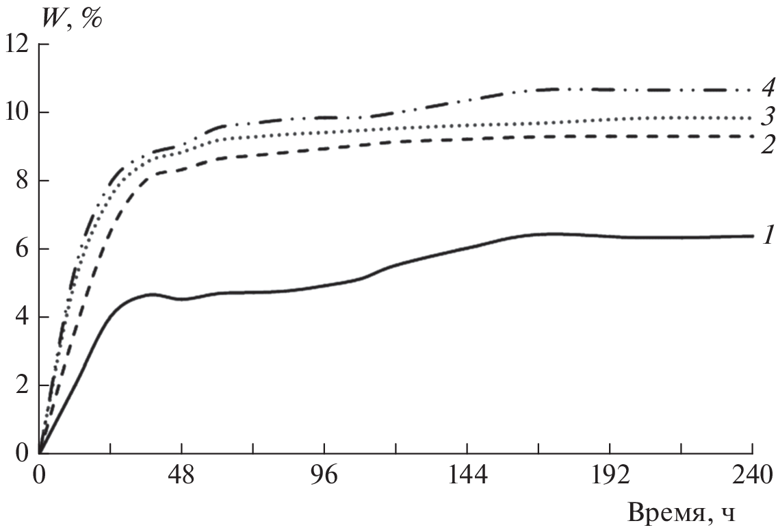 В работе изучено влияние воды на двойные композиции полиэтилен–полилактид различных составов и тройные смеси с добавлением термически состаренного (в присутствии кислорода) полиэтилена как аналога вторично переработанного полимера. Установлено, что состав смеси напрямую влияет на ее характеристики, особенно при воздействии агрессивного фактора – воды. Композиции полиэтилен–полилактид имеют максимальную степень водопоглощения около 7.5%, а в присутствии третьего компонента – окисленного полиэтилена в количестве 40 и 50 мас.% степень водопоглощения увеличивается до 10%. Методом ИК-спектроскопии показано, что после действия воды разрушаются структурные элементы, принадлежащие ПЛА, что обусловлено более активным взаимодействием молекул воды с молекулами ПЛА, в то время как характеристики матрицы полиэтилена практически не изменяются.