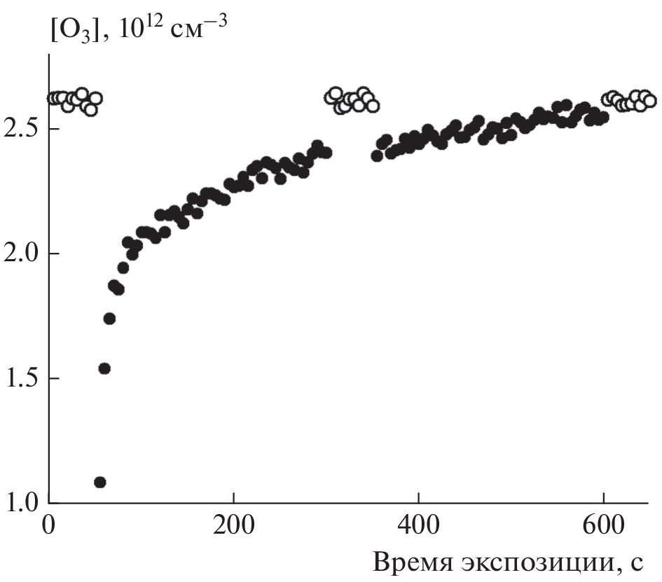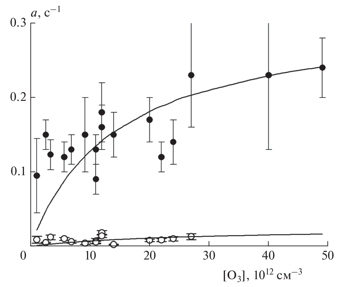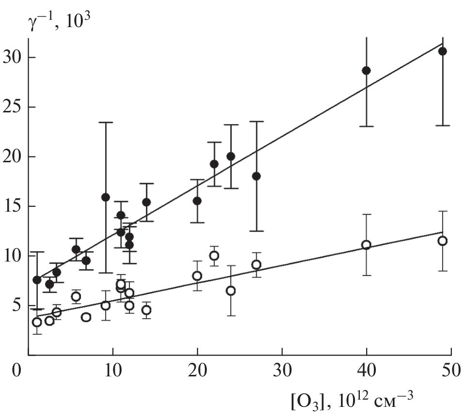 The uptake of O3 (1 × 1012–5× 1013 cm−3) on a methane soot coating preliminarily exposed to N2O5, is studied using a flow reactor with a movable insert. Based on the dependence of the ozone uptake coefficient on the exposure time and O3 concentration, the uptake mechanism is established and a number of elementary parameters are obtained that describe the uptake process at arbitrary O3 concentrations. Based on the Langmuir representation of adsorption, a model description of the uptake on soot under conditions of the competitive adsorption of O3/NOx, where NOx = NO2 and N2O5, taking into account the multistage uptake process, is proposed. Based on the developed model and elementary parameters describing the uptake of O3, NO2, and N2O5 on a fresh soot surface, as well as the uptake of ozone on a surface pretreated with NO2 and N2O5, numerical estimates were made of the additional contributions to the ozone uptake for two real scenarios of the O3/NOx ratio. For an industrial region in winter, when the ozone concentration is minimal (10 ppb O3, 17 ppb NO2, and 4 ppb N2O5), the additional integral contribution to the uptake of O3 on the reaction products of NO2 with soot is 68%, and in the case of N2O5, it is 3.6%. For the same region in summer, at the maximum ozone concentration (36 ppb O3, 17 ppb NO2, and 4 ppb N2O5), the analogous contributions will be 20 and 1%, respectively. The reasons for this difference are discussed.
