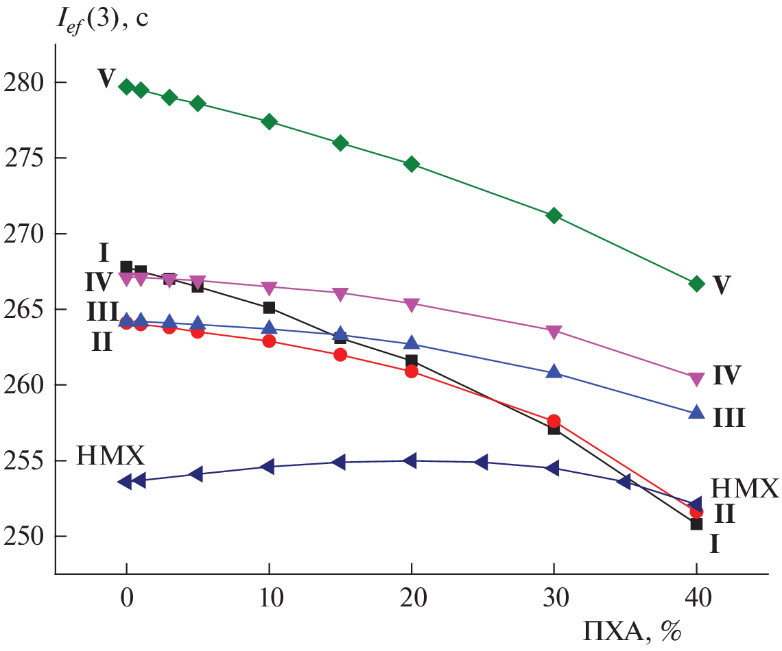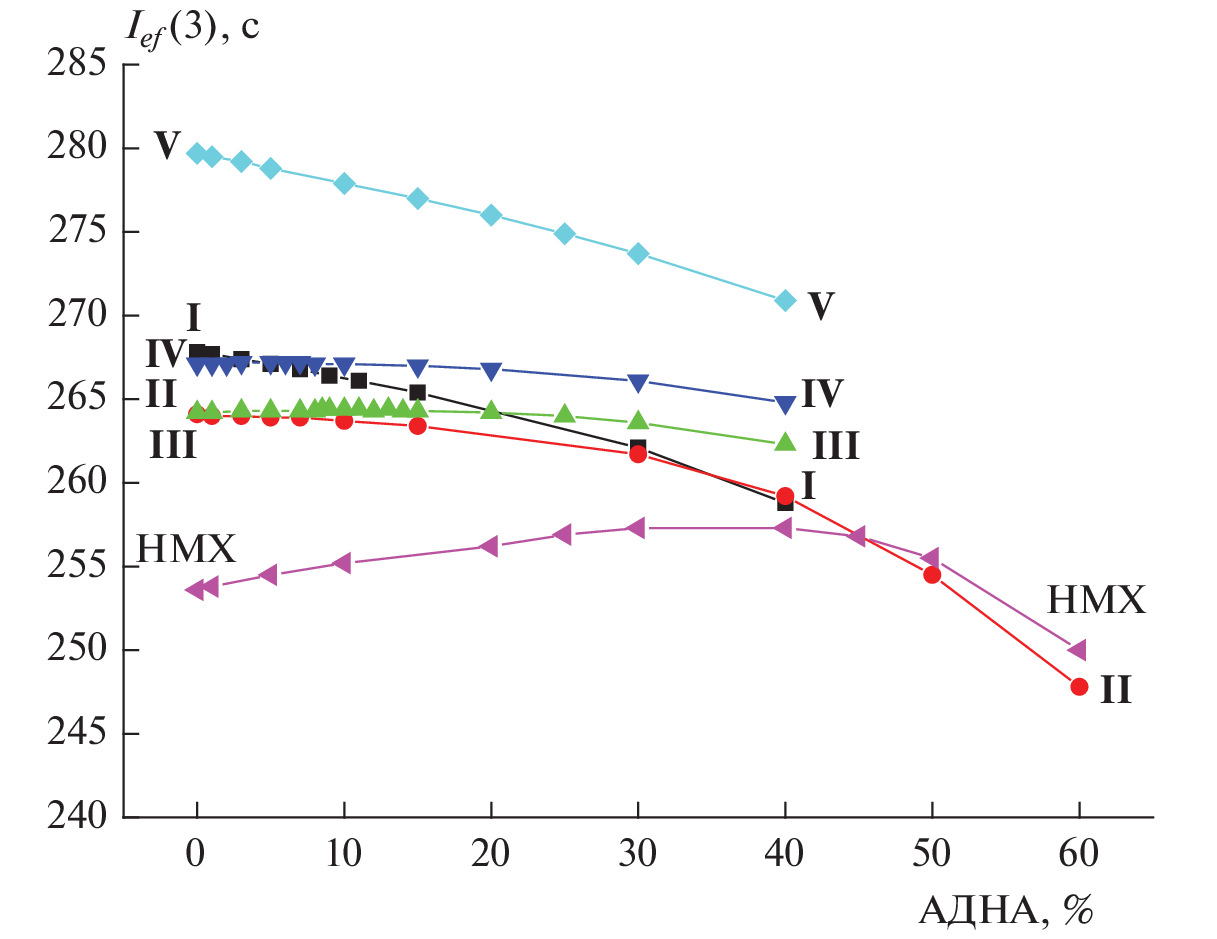 The ballistic characteristics of energy systems based on hydroxylammonium salts of nitroamine derivatives of some polynitrogen fused heterocycles are considered. The quantitative dependences of the energy parameters of such systems on the properties of the studied compound (the main filler), the proportion of aluminum, the presence of additional oxidizing agents in the composition, and the type of binder are established. All the considered compounds (I–V) outperform the classical energy components in the class of composite propellants (CPs) without condensed combustion products. The most effective component is dihydroxylammonium salt (E)-1,2-bis(3-nitroamino-[1,2,4]triazolo[4,3-b][1,2,4,5]tetrazin-6-yl)diazene (V), which significantly exceeds many of the known components in terms of the value of the effective impulse in the third stage (Ief(3) = 279.7 s). However, when using a more realistic value of the enthalpy of the formation of compound V (according to our estimate) in the calculations, the indicator for the composition based on compound V dropped to 266.8 c, and the dihydroxylammonium salt of 1,4-bis(nitroamino)-3,6-dinitropyrazolo[4,3-c]pyrazole (I) with Ief(3) = 267.8 s performed the best.