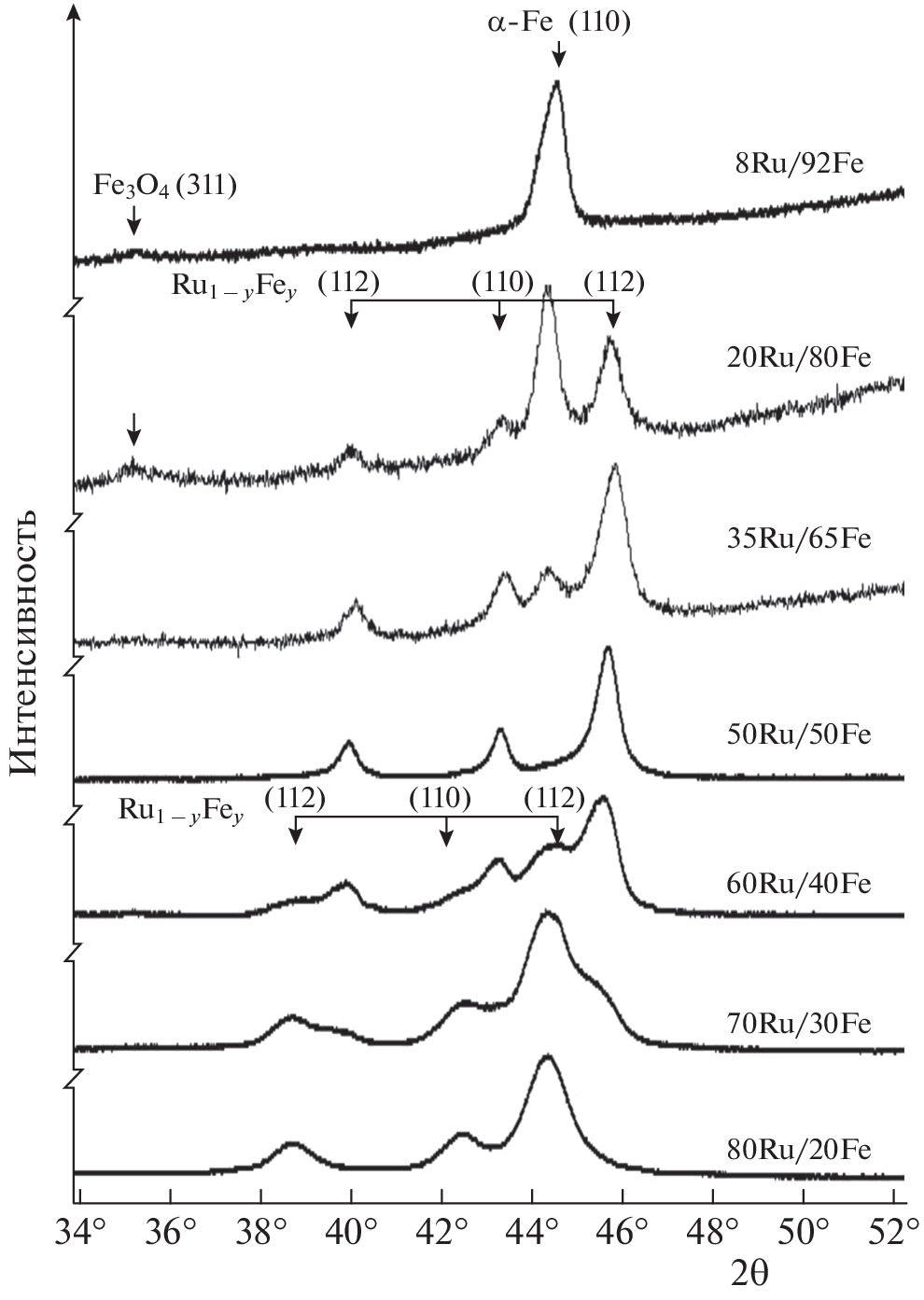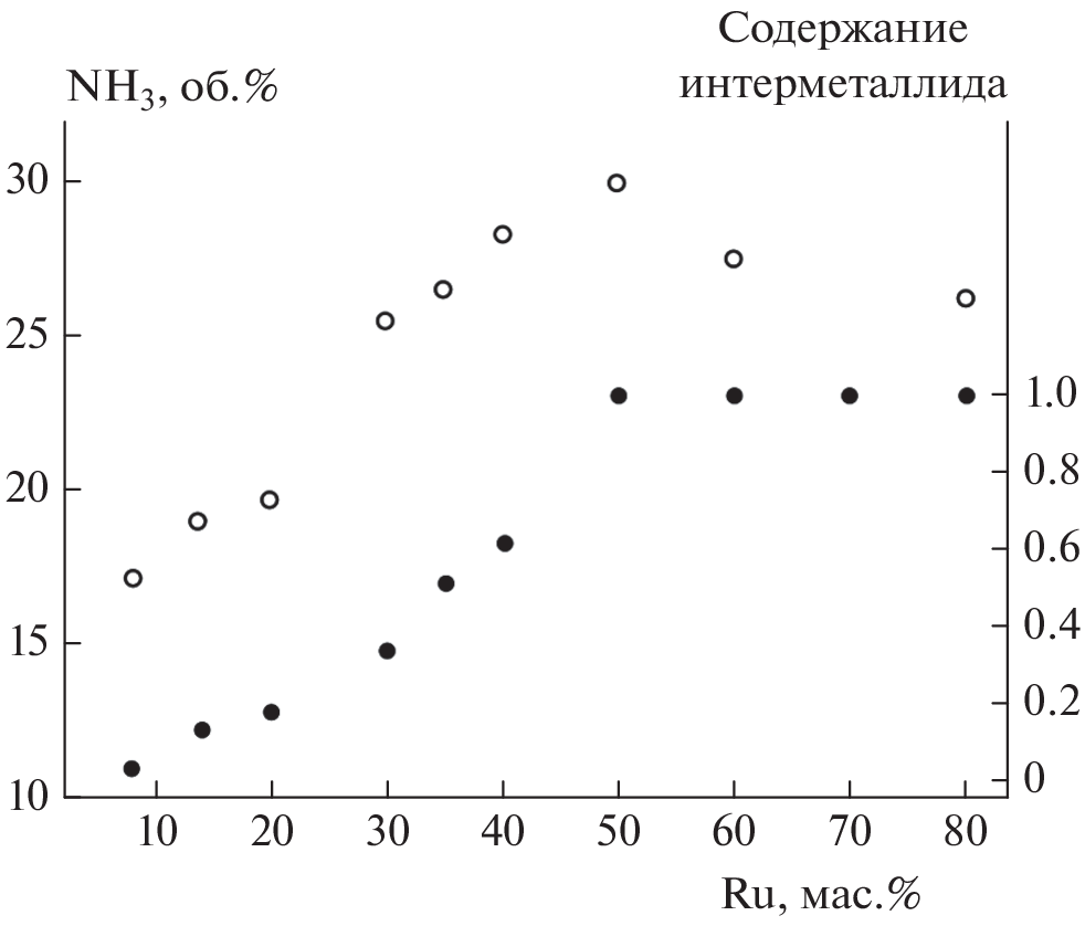 The interrelation of the structure and catalytic properties of hydrogen-reduced iron-ruthenium systems in the ammonia synthesis reaction is studied by X-ray diffraction (XRD), as well as conversion and absorption Mössbauer spectroscopy (MS). It is found that a sample with a metal content of 50Fe/50Ru (wt %) exhibits the maximum catalytic activity in the synthesis of ammonia. It is shown that Fe–Ru intermetallic nanoclusters with a coherent scattering region (CSR) of ~11 nm are formed in the binary system.