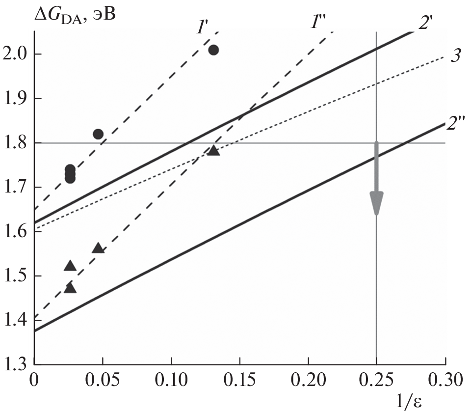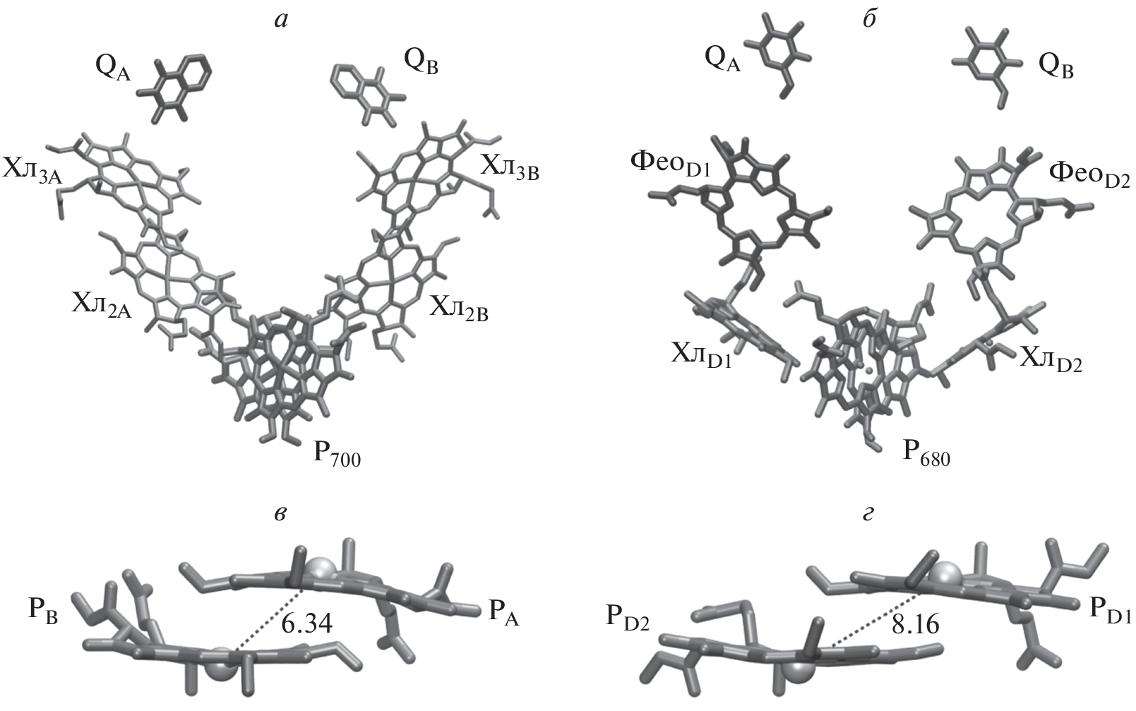 В работе анализируется энергетика реакций фотоиндуцированного разделения зарядов между близкорасположенными молекулами хлорофилла (Хл) и феофитина (Фео). Реакционные центры фотосистем (ФС) 1 и 2 включают в себя три пары спектрально-сходных порфириновых кофакторов, структура которых допускает возможность реализации альтернативных механизмов первичного разделения зарядов. Рассматривается континуальная модель образования ион-радикальных пар в диэлектрическом окружении, основанная на рассчитанных ab initio парциальных зарядах. Модель описывает экспериментальную зависимость среднеточечных редокс-потенциалов Хл и Фео в растворах с различной диэлектрической проницаемостью. В рамках этой модели определена энергия образования первичных ион-радикальных пар для обсуждаемых в литературе альтернативных механизмов разделения зарядов в ФС 1 и ФС 2. В рассматриваемом приближении в ФС 2 первичное разделение зарядов между мономером Хл (ХлD1) и Фео (ФеоD1) является единственным энергетически допустимым механизмом. Отсутствие Фео в аналогичной позиции в реакционном центре ФС 1 приводит к тому, что в этом комплексе мономер Хл не может выступать в качестве первичного донора электрона. Стабилизация первичной ион-радикальной пары в ФС 1 может происходить за счет делокализации электронной плотности в димере специальной пары молекул Хл (Р700) и гетеродимере молекул Хл, образующих первичный акцептор А0.