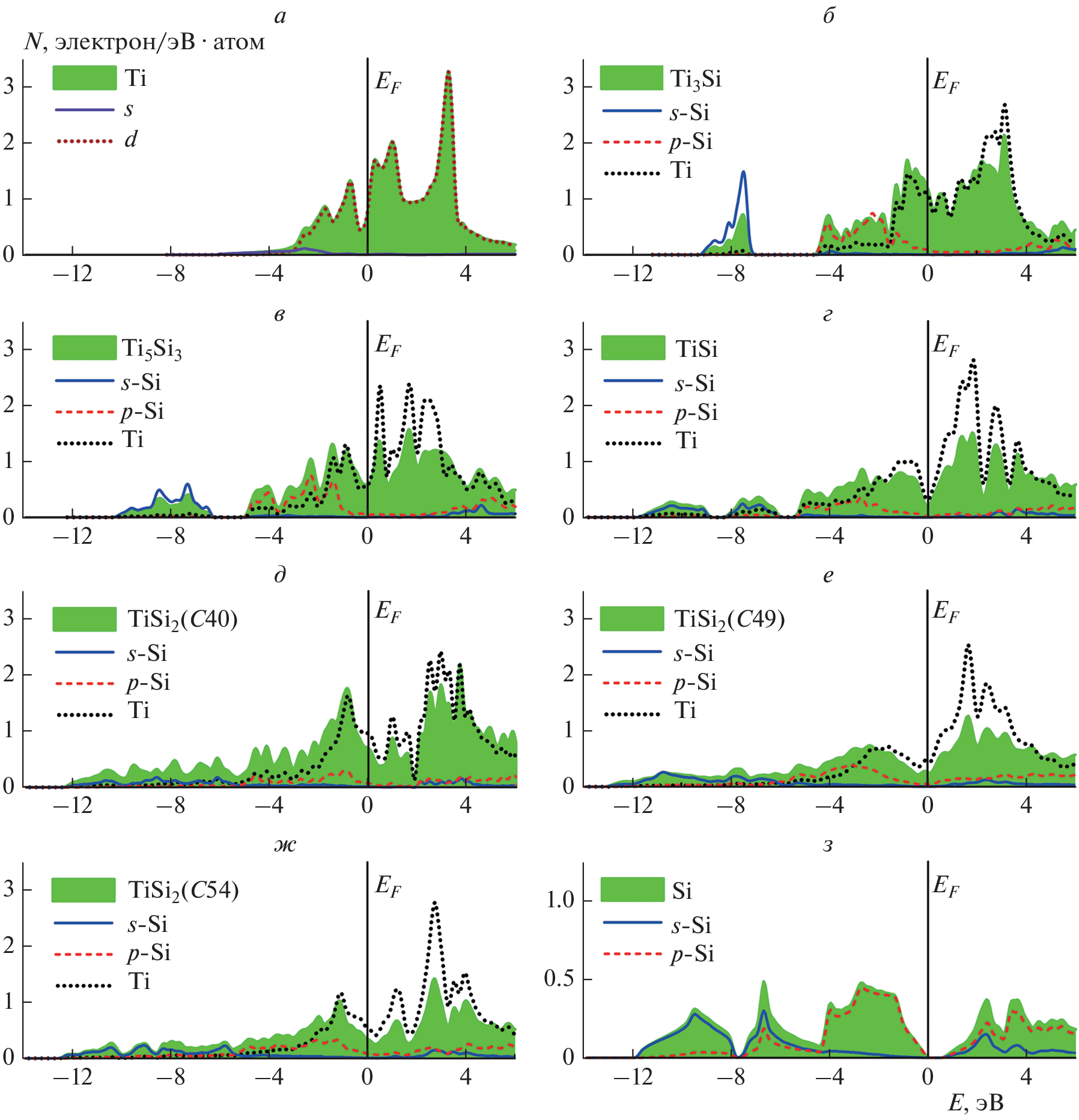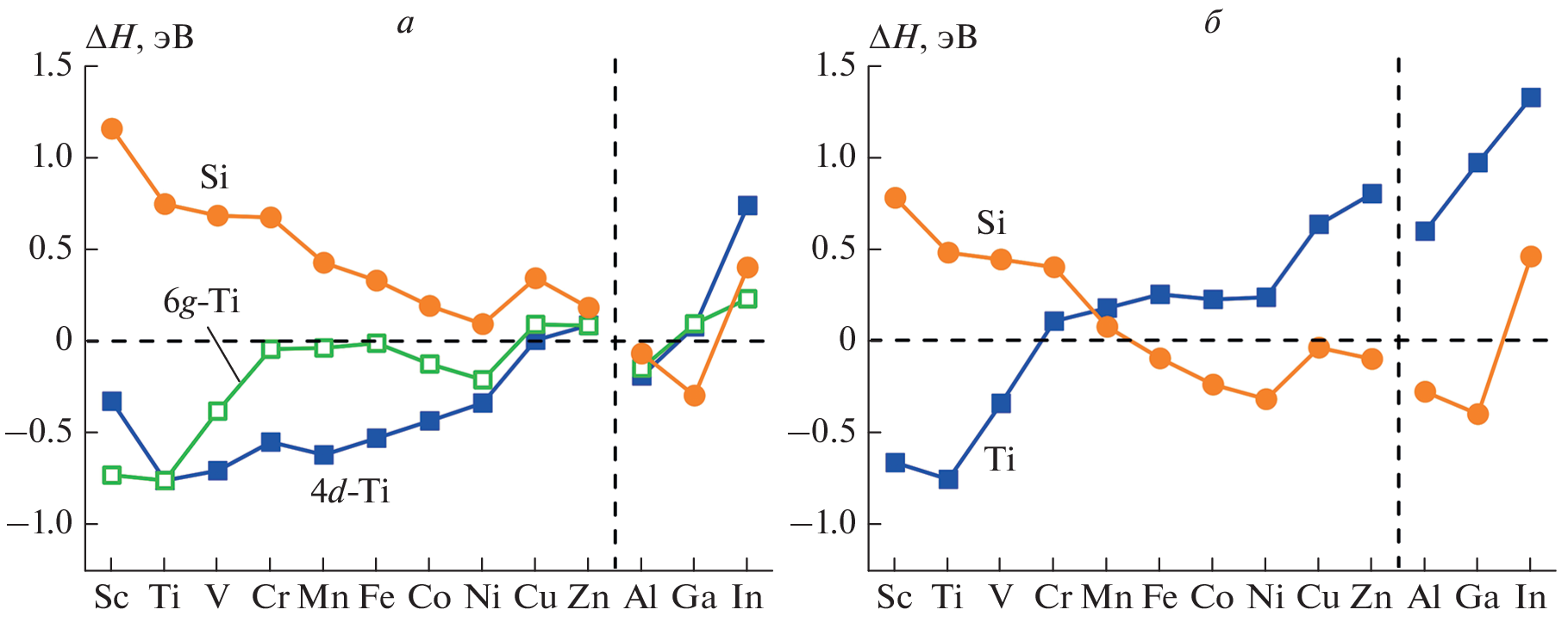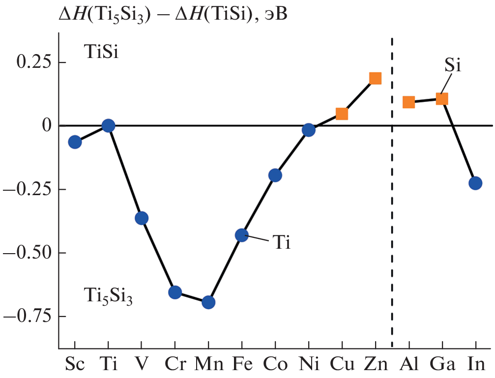 The total energies of a number of Ti–Si intermetallic phases are calculated by the projector augmented-wave method. It is shown that the formation enthalpies of Ti5Si3 and TiSi are almost equal. The peculiarities of the density of electronic states of the considered titanium silicides and its evolution with increasing silicon content are discussed. The formation energies of doped titanium silicides Ti5Si3 and TiSi are calculated depending on the position of the impurity on different sublattices. It is established that the elements of the 3d-period prefer to replace titanium in Ti5Si3, while the elements of the second half of the 3d‑period substitute silicon in TiSi. The effect of impurities on the relative stability of compounds is studied. It is shown that almost all the considered elements except Cu, Zn, Al, and Ga increase the stability of the Ti5Si3 phase with respect to TiSi. The obtained results agree with the available experimental data.