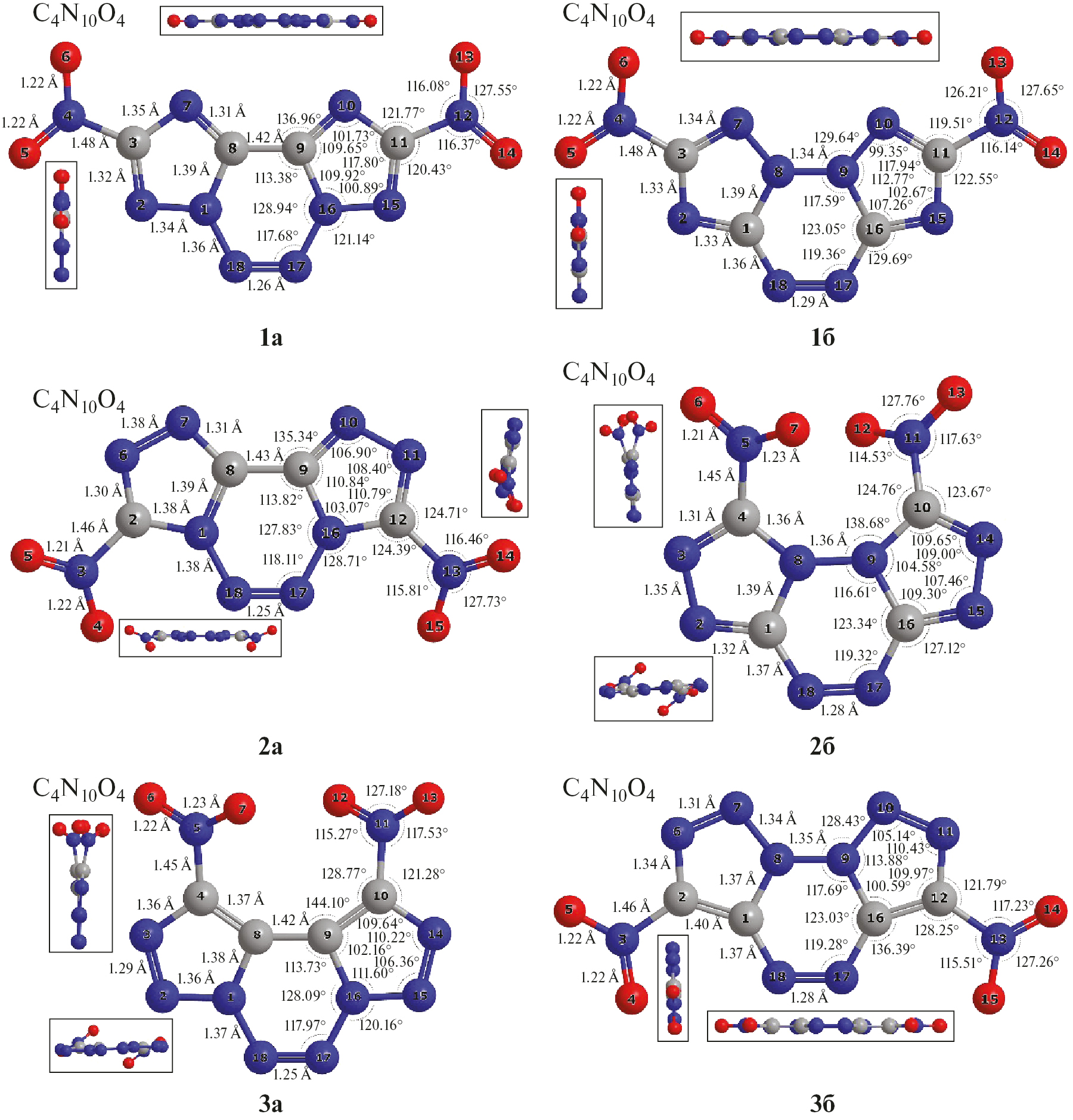 Рис. 2. Структуры изомеров общей формулы C4N10O4 1а,б–3а,б (в разных ракурсах) и их геометрические параметры: длины связи и валентные углы (Å, °). Расчеты выполнены методом B3LYP/6-311+G(2d,p).
